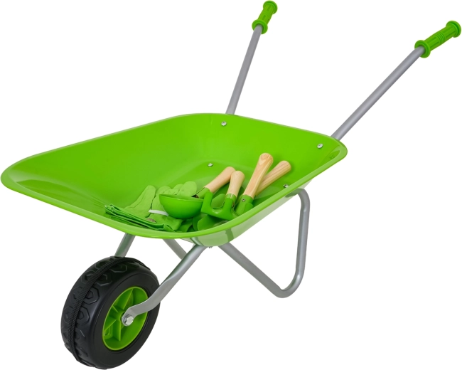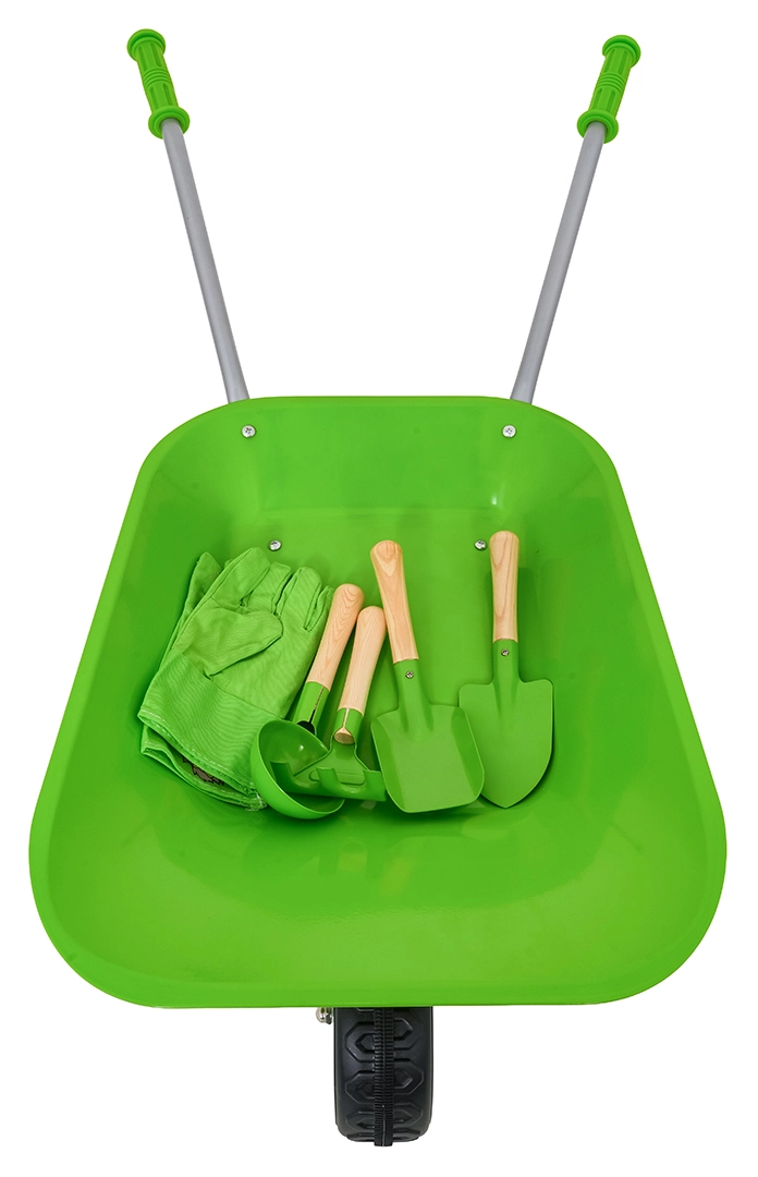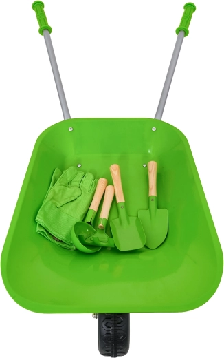 Fomenta la curiosidad y la destreza de los niños con un set que incluye todo lo necesario para sus primeros pasos en la jardinería. La carretilla verde robusta y cuatro herramientas manuales de calidad permiten a los pequeños ayudantes cavar, recoger y rastrillar tierra, trasplantar plantas y transportar materiales. También se incluyen guantes infantiles para proteger las manos.