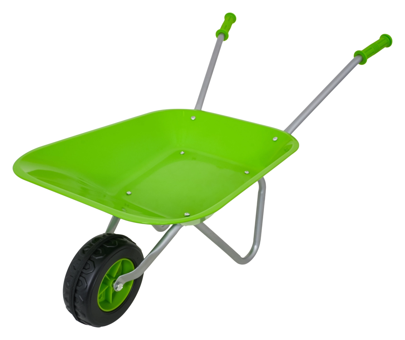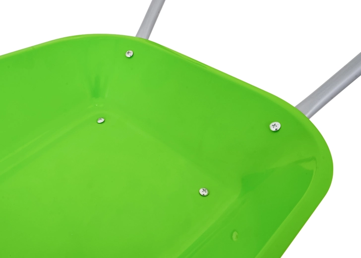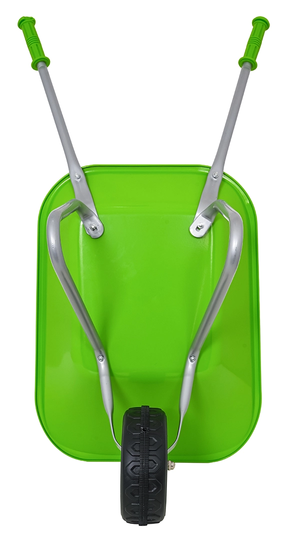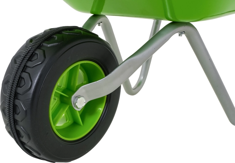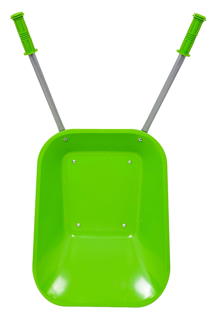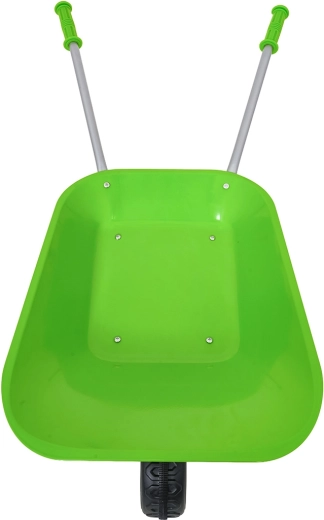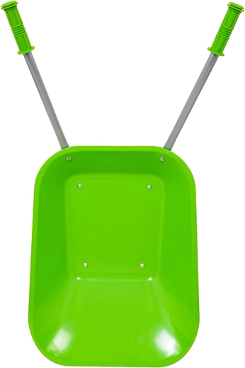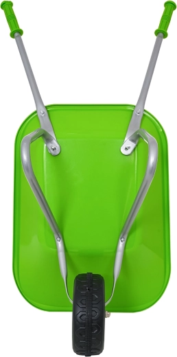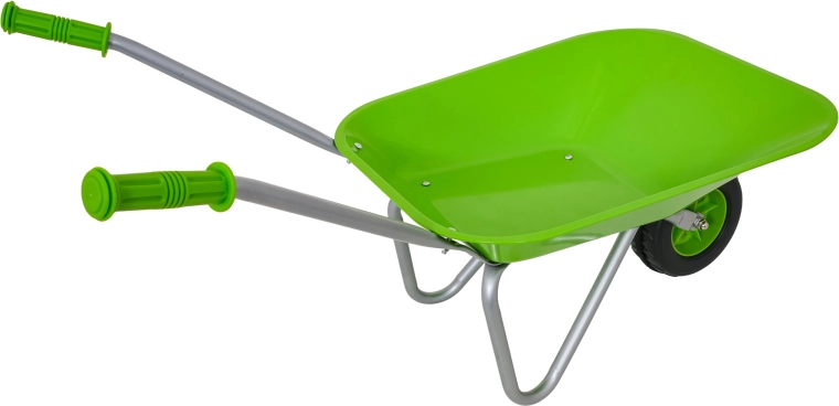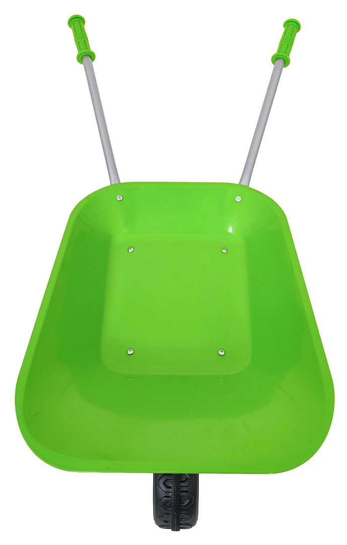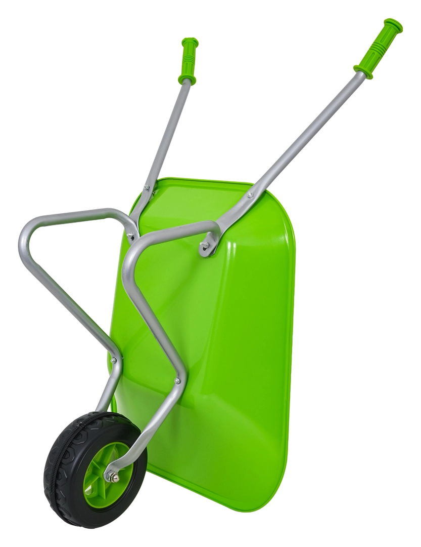Carretilla infantil ligera y estable con cubeta ancha y una sola rueda, perfecta para tierra, hojas y herramientas pequeñas. Mangos ergonómicos con empuñaduras antideslizantes que facilitan la manipulación.