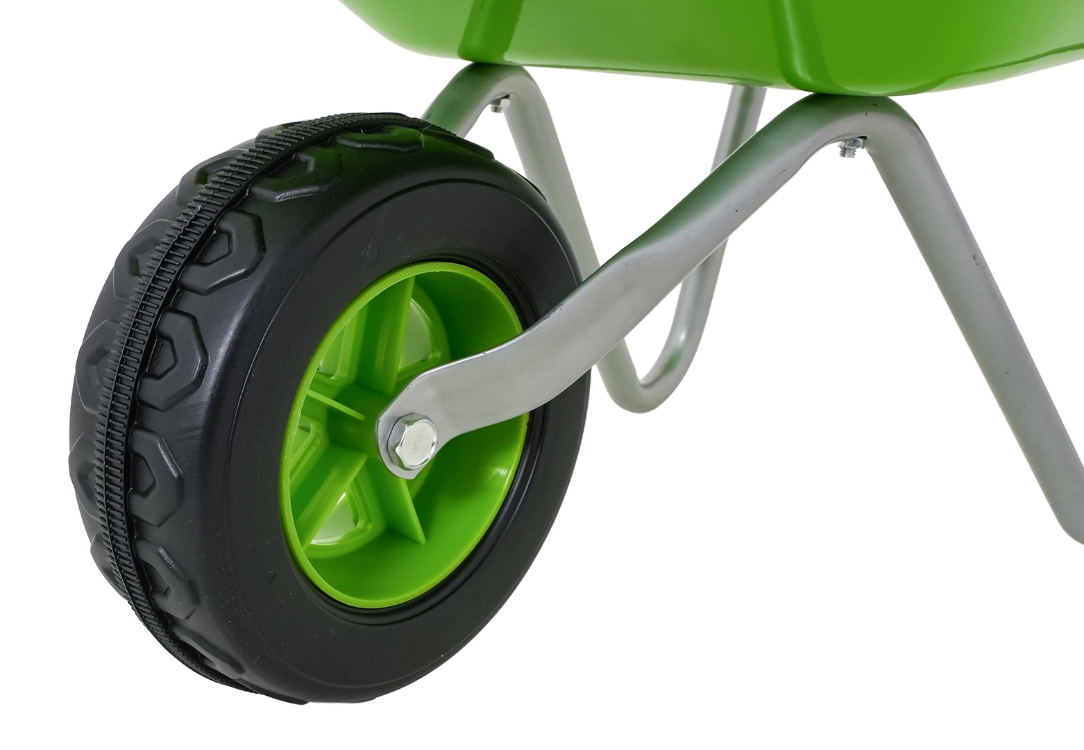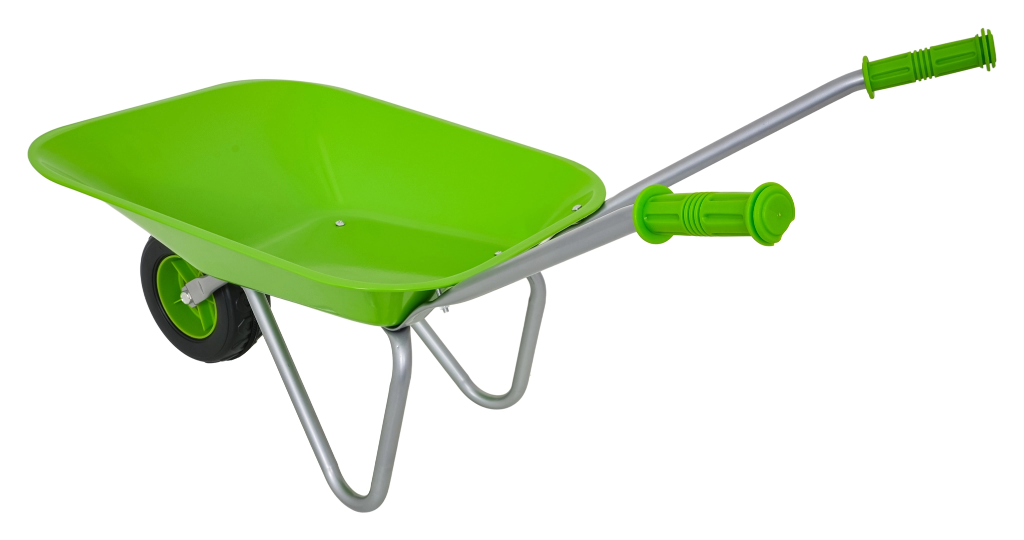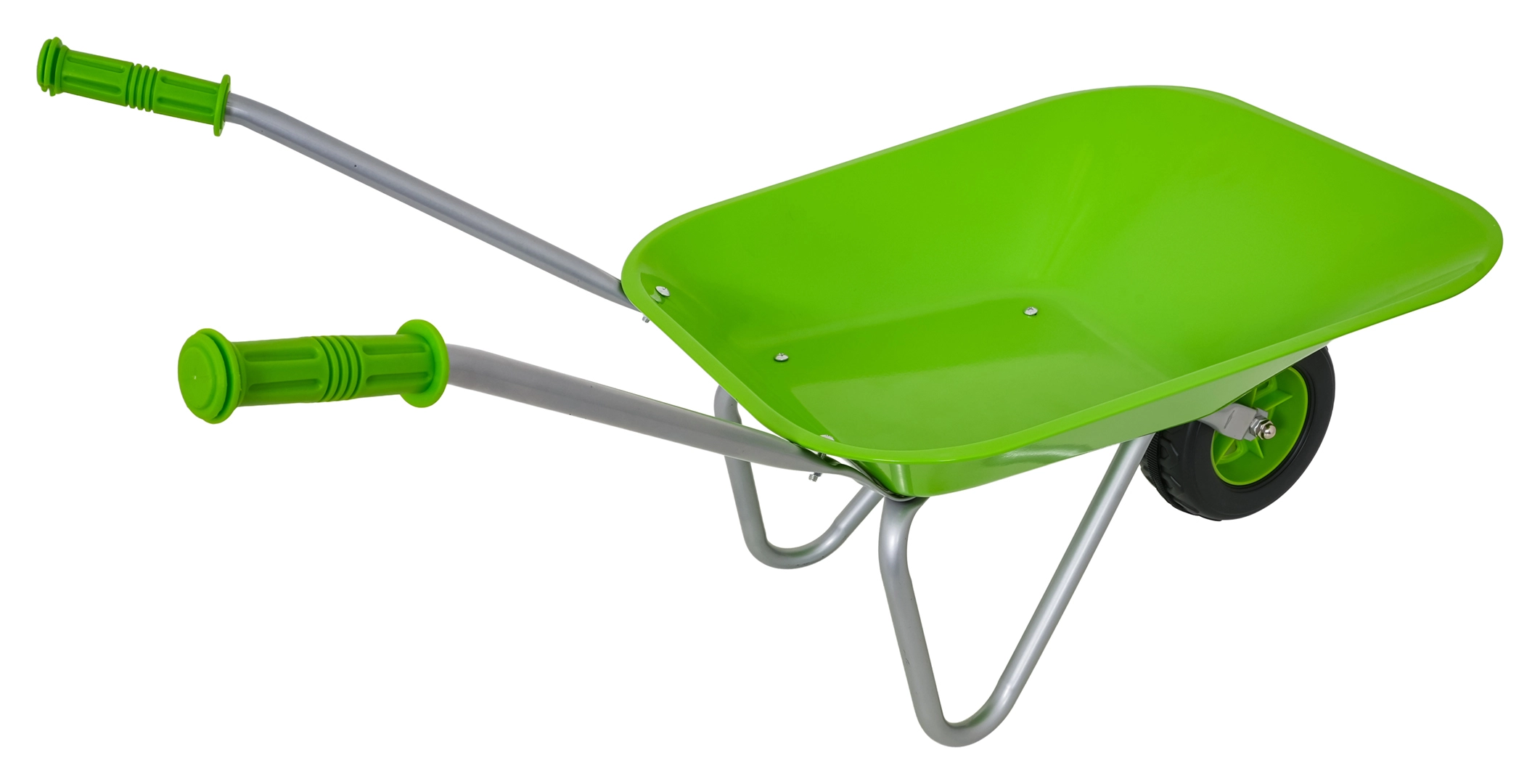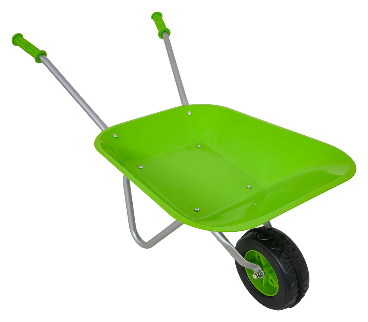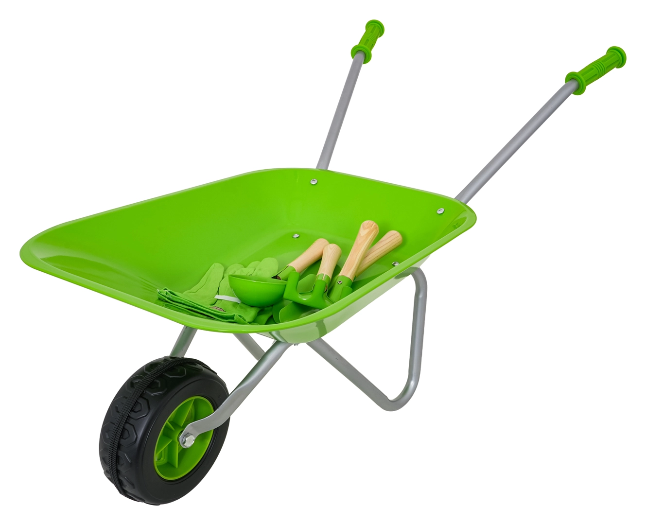 Carretilla infantil ligera y estable con cubeta ancha y una sola rueda, perfecta para tierra, hojas y herramientas pequeñas. Mangos ergonómicos con empuñaduras antideslizantes que facilitan la manipulación.