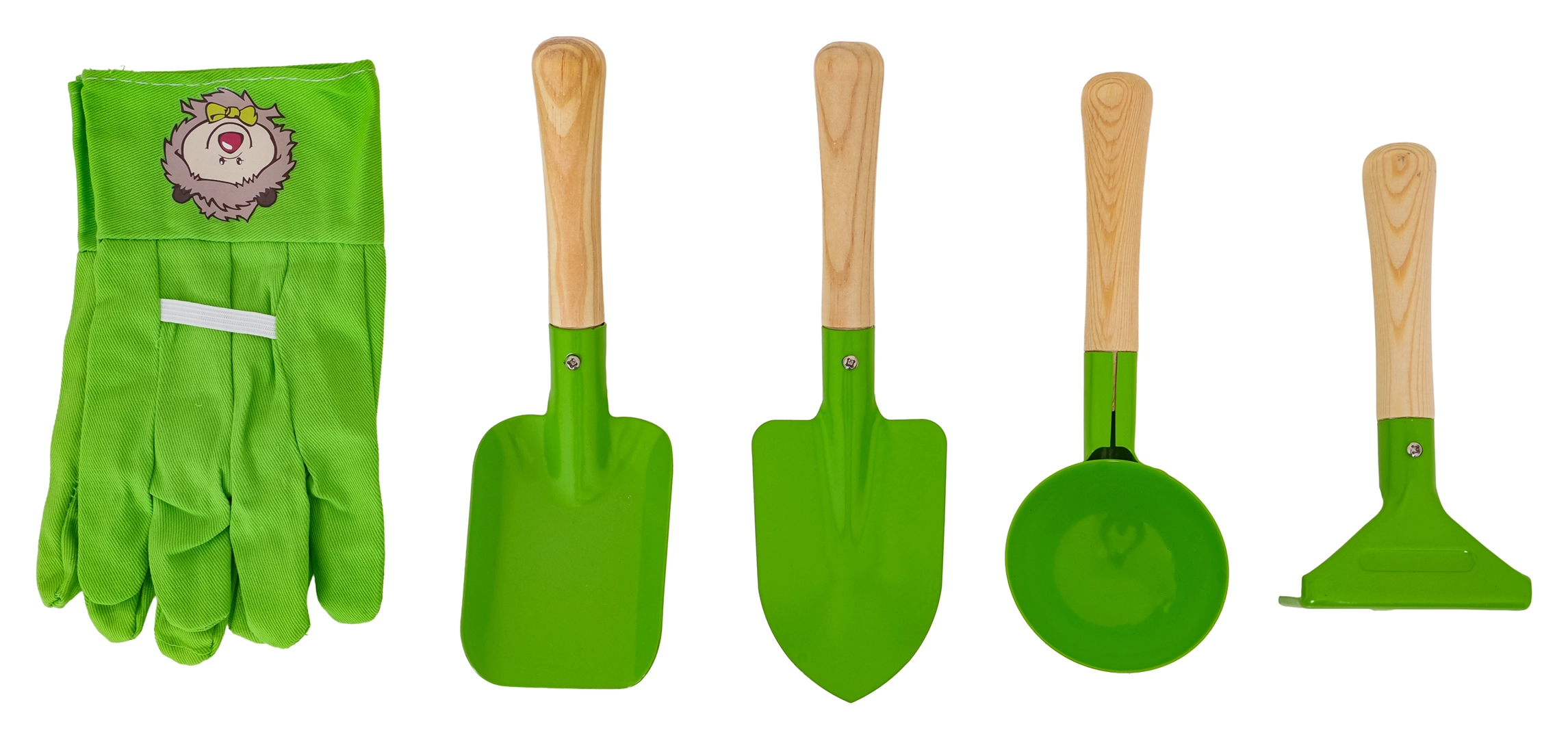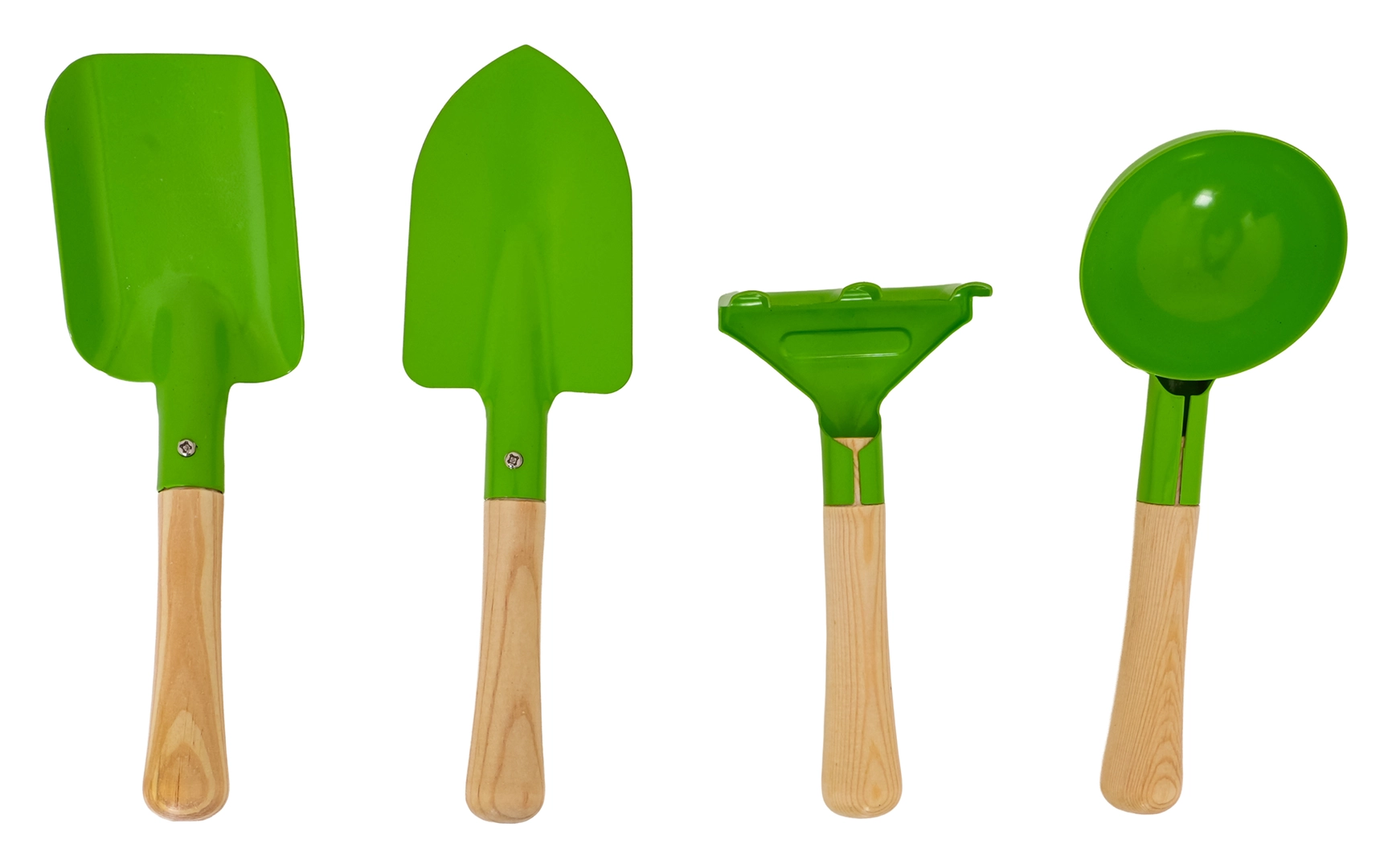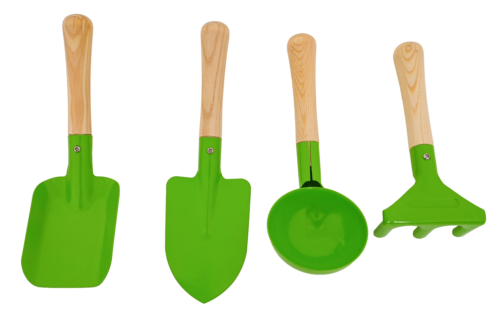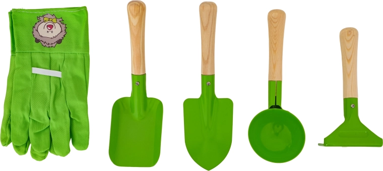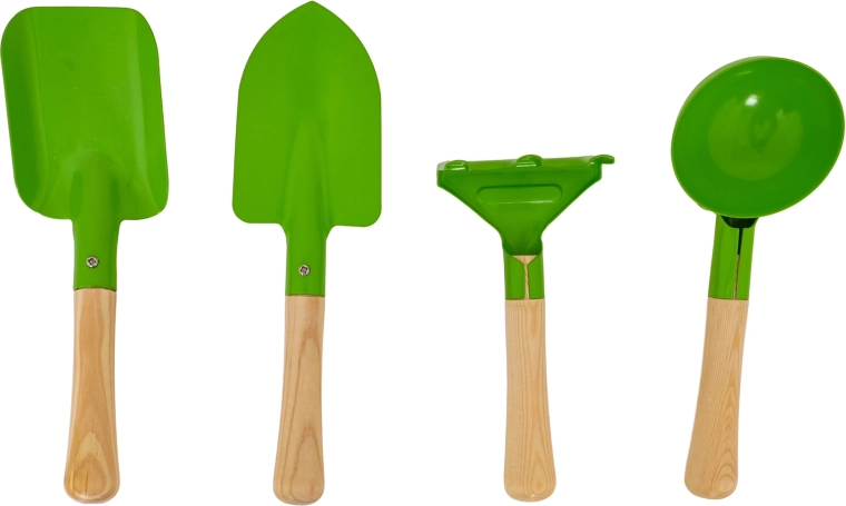 El set incluye una pala, un plantador puntiagudo, un cazo redondo y un pequeño rastrillo. Las cabezas de metal robustas y los mangos de madera lisa ofrecen comodidad y larga durabilidad.