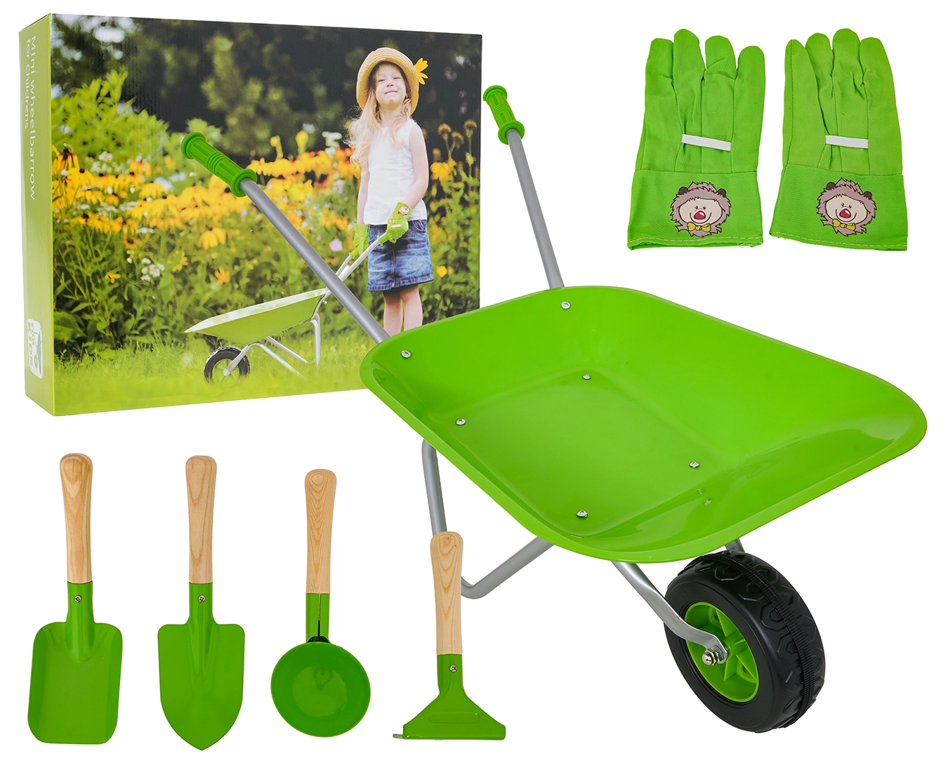 Qué encontrarás en el set: carretilla, pala lisa, plantador puntiagudo, cazo redondo para tierra, pequeño rastrillo/raspador y guantes infantiles. Las partes metálicas son resistentes al óxido, los mangos de madera se adaptan a manos pequeñas y todo el conjunto se monta de forma rápida y sencilla.
