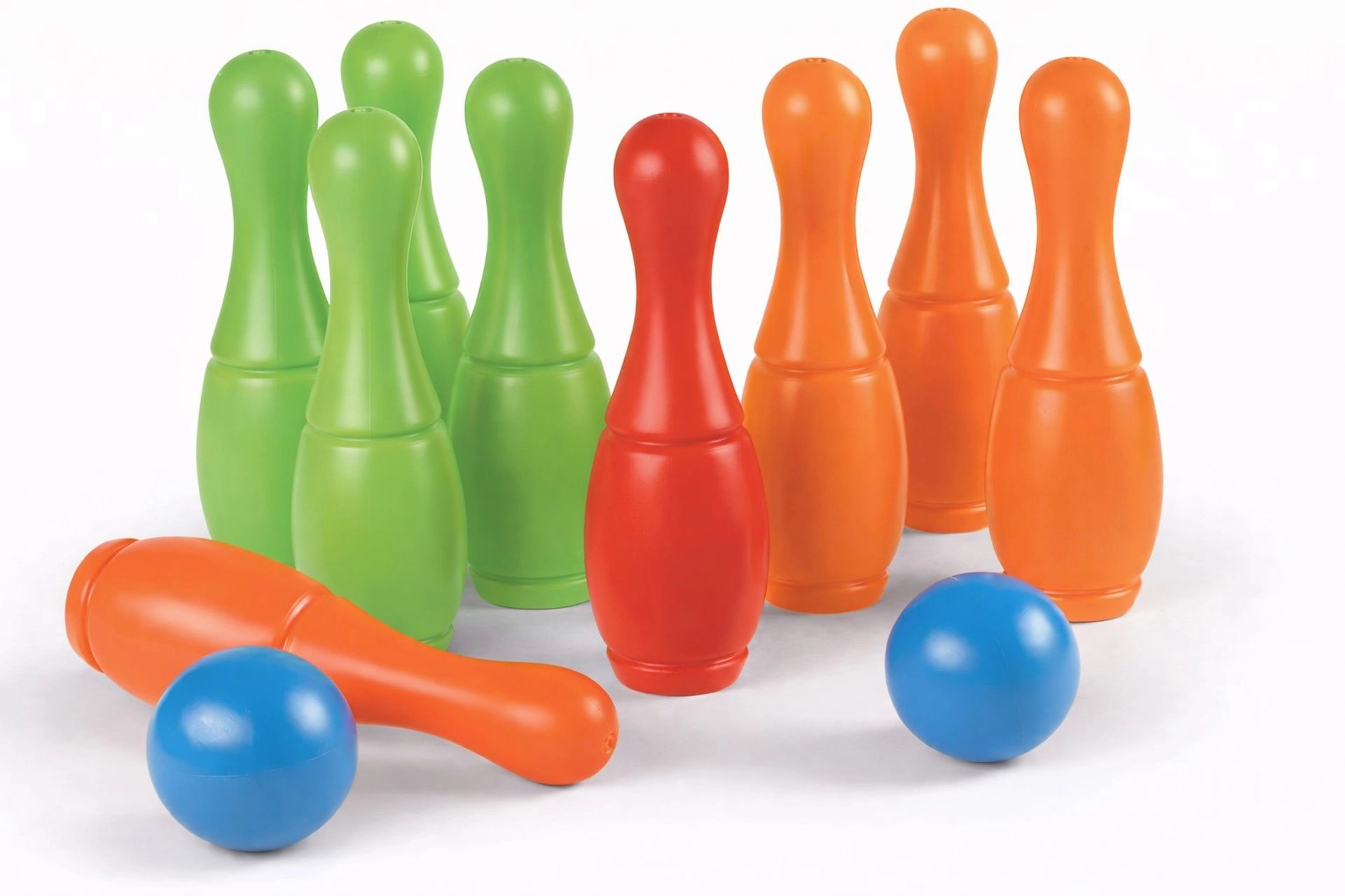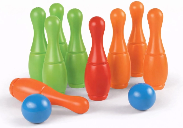 El set está diseñado para un uso sencillo: las aberturas de llenado se cierran tras el relleno con pequeños tapones que forman parte del soporte negro para los bolos. Gracias a la altura de los bolos de 27 cm, el juego es claro incluso para los más pequeños y favorece el desarrollo de la motricidad, la coordinación y la precisión.