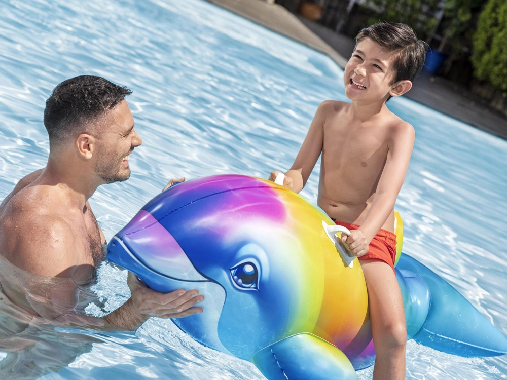El acabado multicolor con forma de delfín encantará a los niños y fomentará el juego activo en el agua. El flotador es adecuado para piscinas, lagos y mar en calma y, gracias a su estructura ligera, se transporta y almacena fácilmente. Apreciarás el inflado y desinflado rápidos en cada salida al agua.
