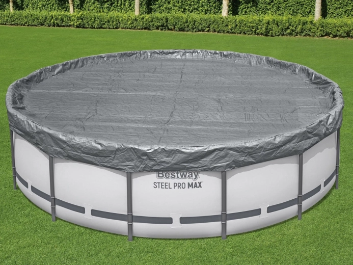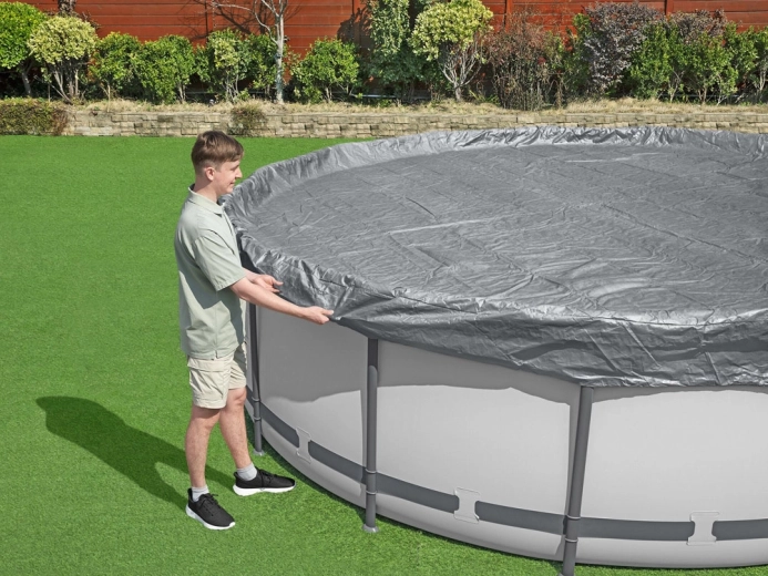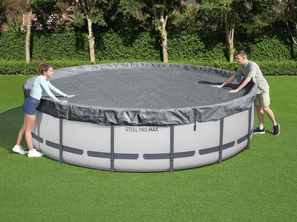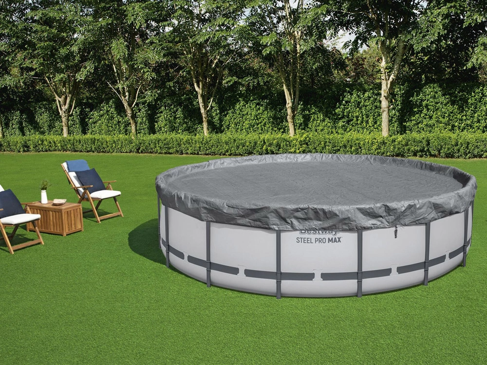 Mantenga el agua de la piscina más limpia durante más tiempo. La lona de cobertura prémium BESTWAY con diámetro de 4,57 m está diseñada para piscinas elevadas redondas y combina resistencia, protección UV y sujeción fiable. Los orificios de drenaje integrados evitan la formación de charcos en la superficie y facilitan el uso diario.