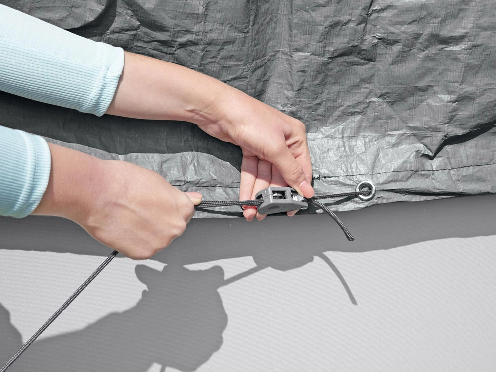 El mecanismo de ajuste integrado con tope asegura la lona alrededor del borde de la piscina para una sujeción segura y estable.