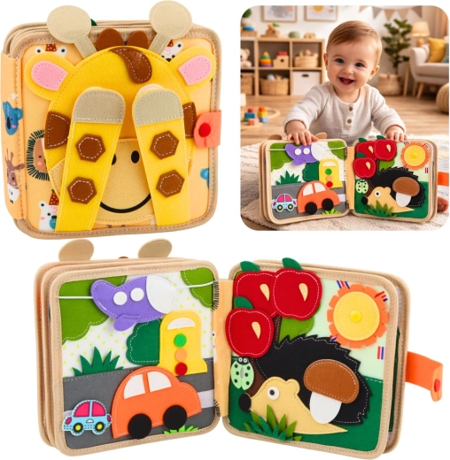 Suave libro sensorial de fieltro con una jirafa en la portada que ofrece a los niños variados elementos interactivos que fomentan la motricidad fina, la coordinación mano–ojo y el aprendizaje de colores y formas. Gracias a las piezas deslizantes y ajustables y a las escenas coloridas, los niños juegan y desarrollan habilidades de forma inteligente, en casa, en preescolar y durante los viajes.