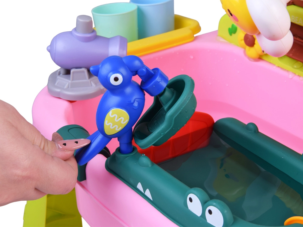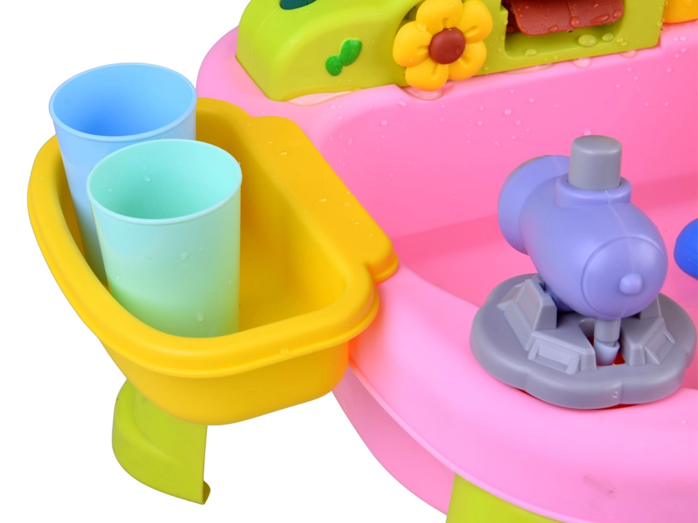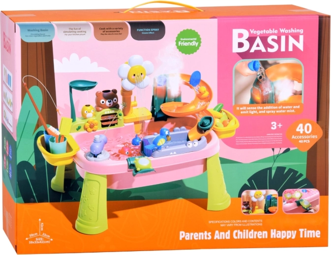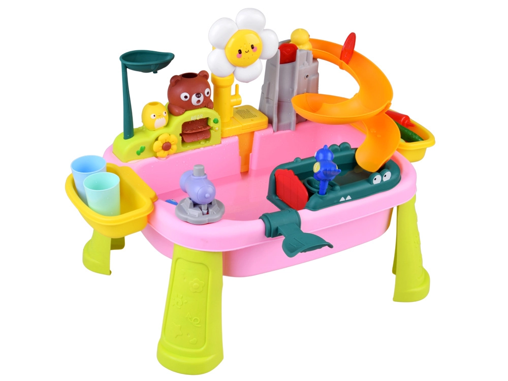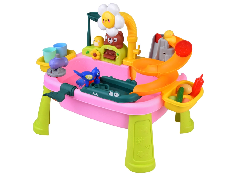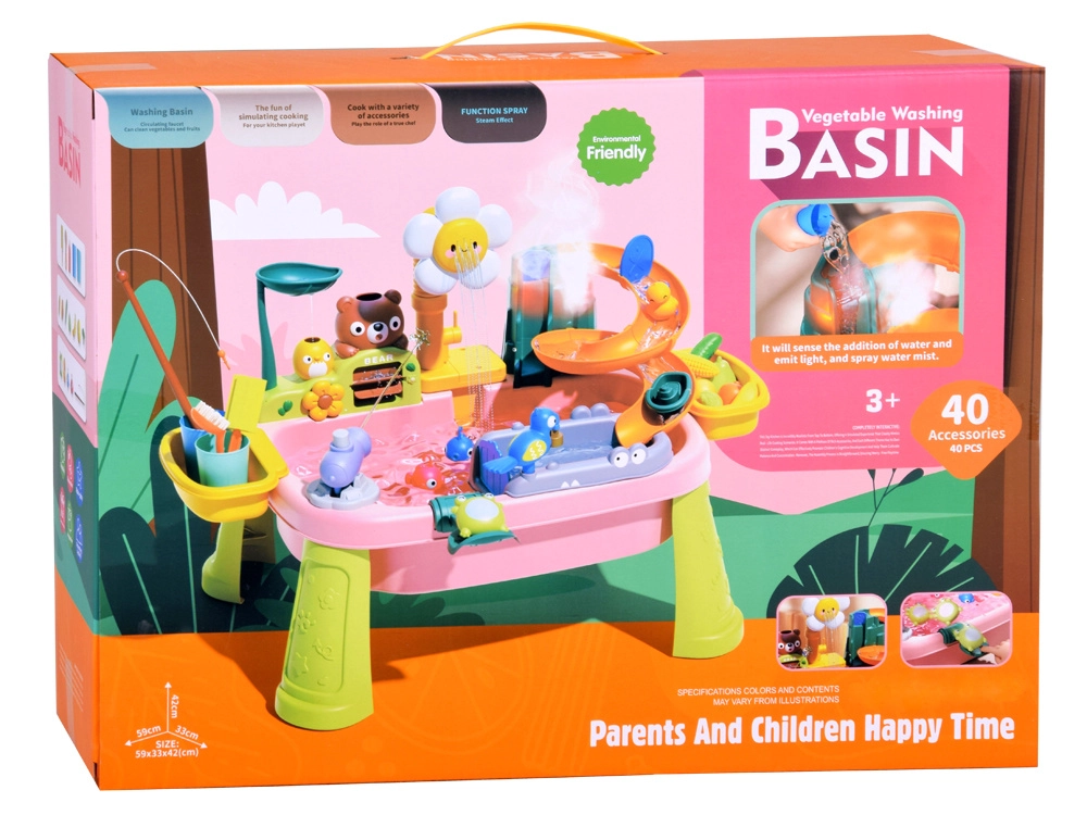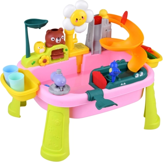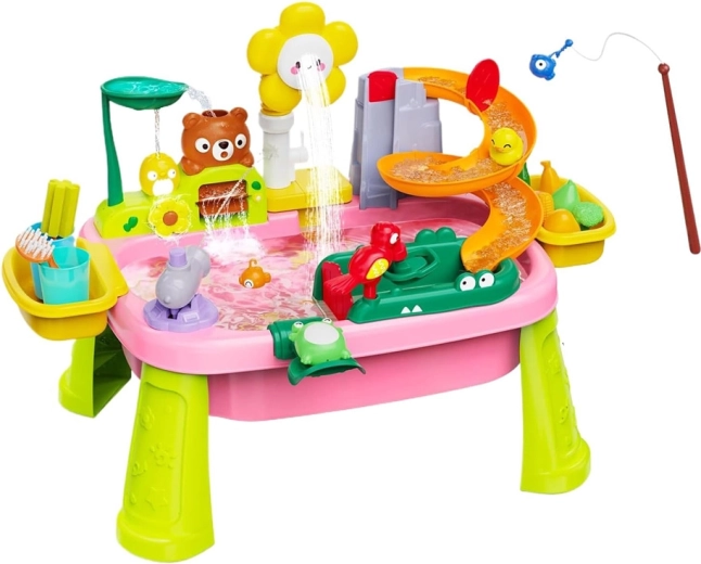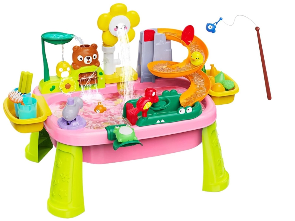 Descubre la diversión con una colorida mesa de agua que convierte cada día en una aventura. Los niños disfrutarán de agua corriente, tobogán, rociador con forma de flor, pesca y lavado de “alimentos”. La mesa fomenta la creatividad, la motricidad fina y la estimulación sensorial, ideal para casa y exterior.