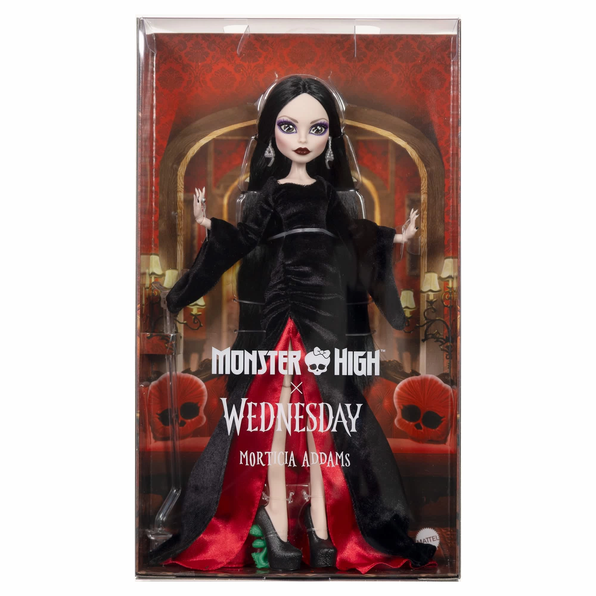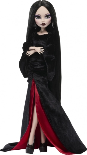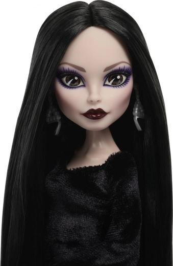 Descubre la oscura elegancia del célebre personaje MORTICIA ADDAMS en la colección Monster High Collector. La muñeca destaca por su largo vestido negro con mangas amplias y dramáticas, textura aterciopelada y acentos carmesí en la abertura. El cabello implantado (rooted) de aspecto realista, la piel pálida y el maquillaje marcado realzan la apariencia auténtica vista en la serie WEDNESDAY.