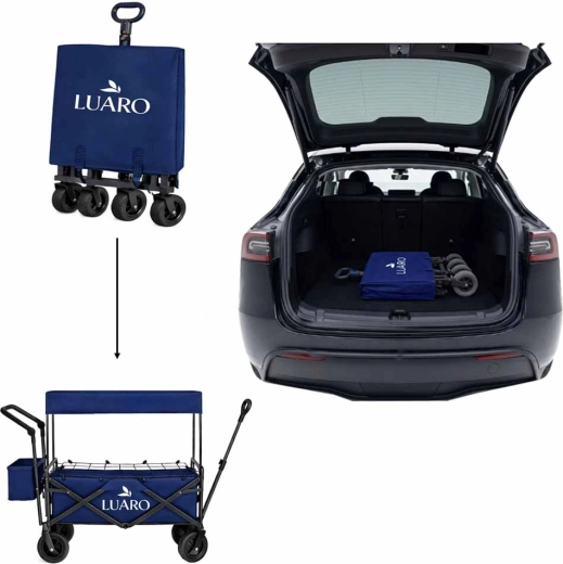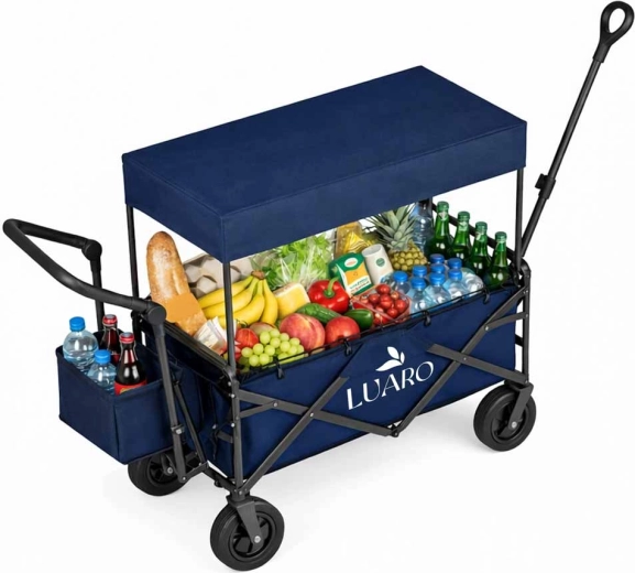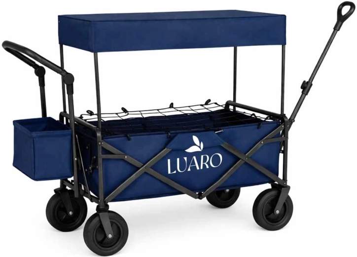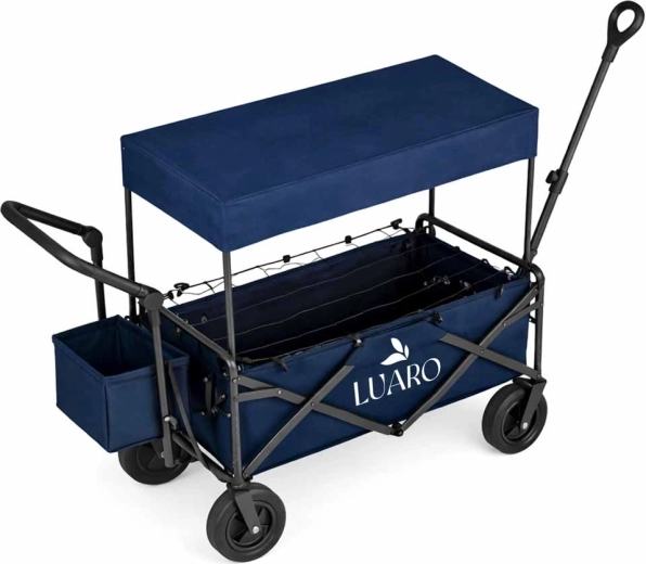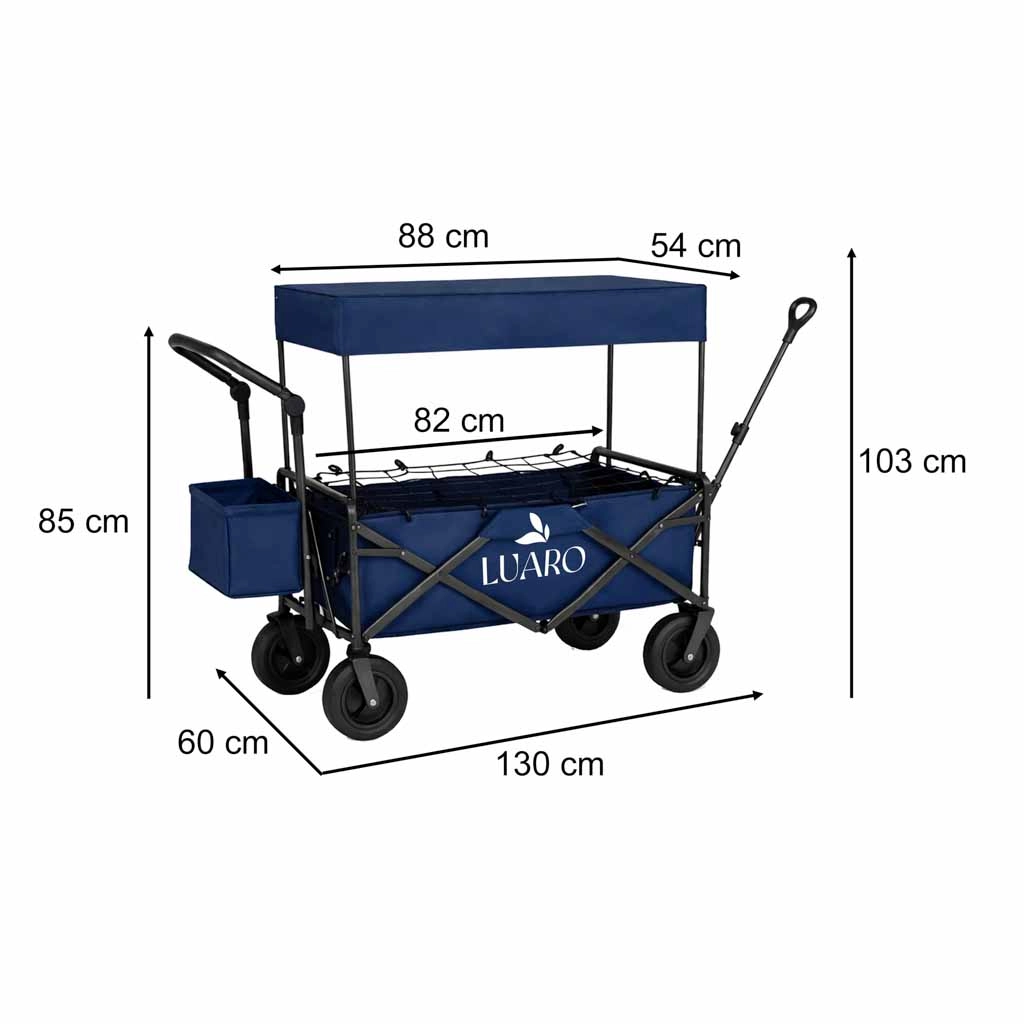 El carrito plegable universal LUARO con toldo facilita el transporte de objetos a la playa, al camping e incluso por la ciudad. Gracias a su estructura robusta, ruedas anchas todoterreno, ruedas delanteras giratorias y asas regulables, se maneja con facilidad. El práctico toldo protege el contenido del sol y de lloviznas, mientras que los bolsillos laterales y la cesta garantizan un almacenamiento organizado de lo imprescindible.
