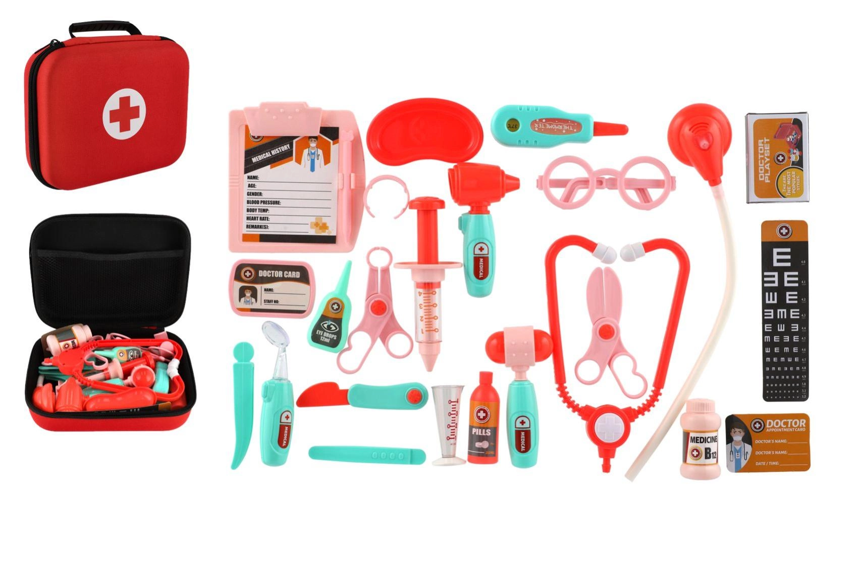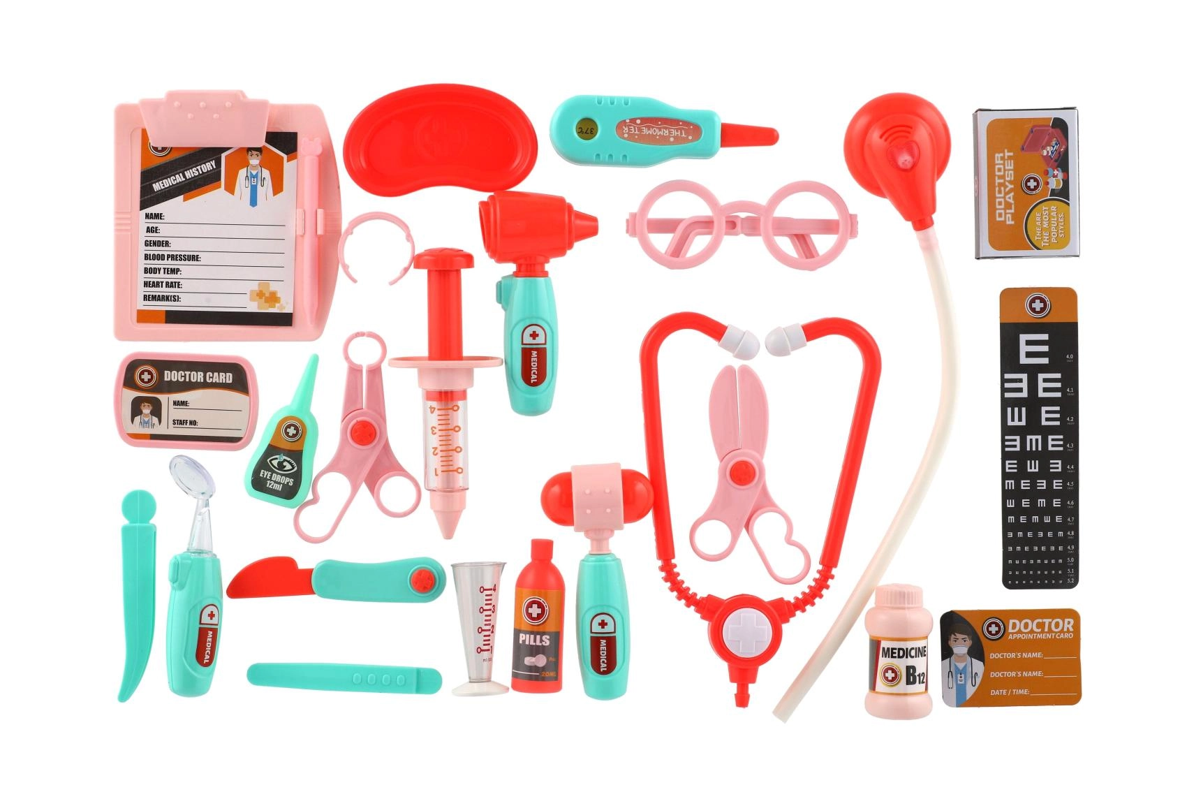 - Estetoscopio, jeringa, otoscopio, termómetro, tijeras, martillo, gafas, pinzas, botellitas para “medicinas”, tarjetas y otros accesorios