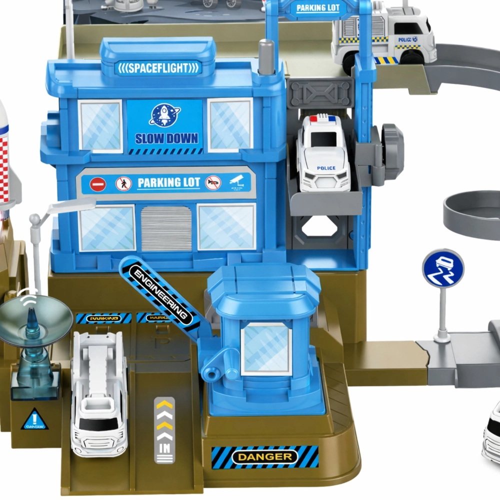 Esta elaborada base espacial con cohete introduce a los niños en un mundo de fantasía, misiones y descubrimientos. La construcción de varios niveles con carretera en espiral, aparcamiento, sistema de ascensor y despegue del cohete estimula escenarios creativos y un juego fluido.
