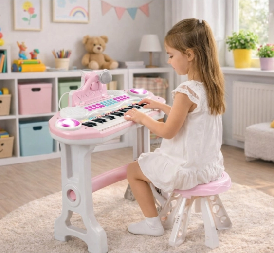 Desarrolla el talento musical de tu hijo con este teclado electrónico rosa de 37 teclas, micrófono y función MP3. Ofrece ritmos divertidos, varios instrumentos, grabación y reproducción, ajuste de tempo y volumen y efectos luminosos LED. Incluye mesa, taburete y atril para partituras para tocar cómodamente.
