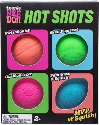 Descubre las pelotas antiestrés Schylling NeeDoh Hot Shots en un práctico set de 4 unidades con diferentes texturas. Son super suaves, encajan perfectamente en la mano infantil y, al apretarlas, siempre vuelven a su forma original. Ideales para viajes, contra el estrés y la ansiedad y para mejorar la concentración. Fabricadas con materiales no tóxicos y en conformidad con las normas europeas de seguridad.