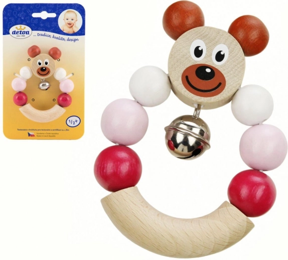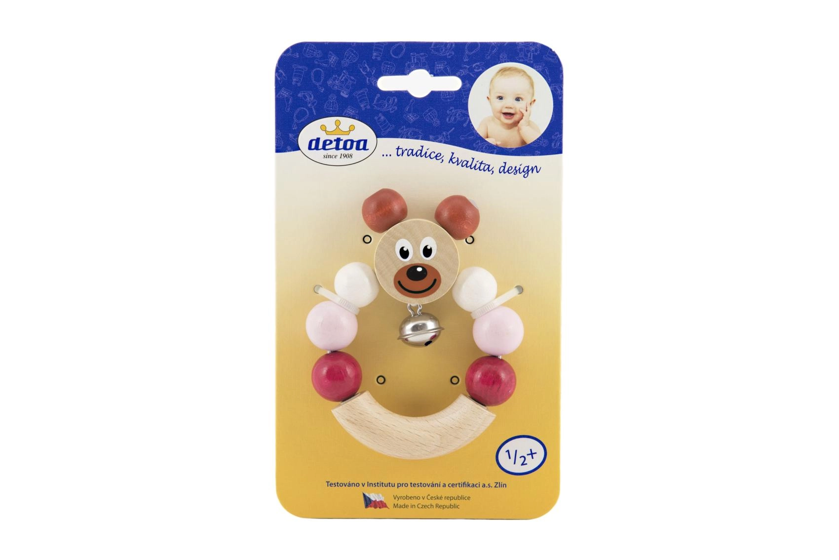 El sonajero Detoa con oso en color rosa es el primer juguete ideal para el desarrollo del oído, el tacto y la motricidad. El suave sonido de la campanilla atrae al bebé, y los materiales agradables y su forma favorecen un agarre seguro y cómodo.