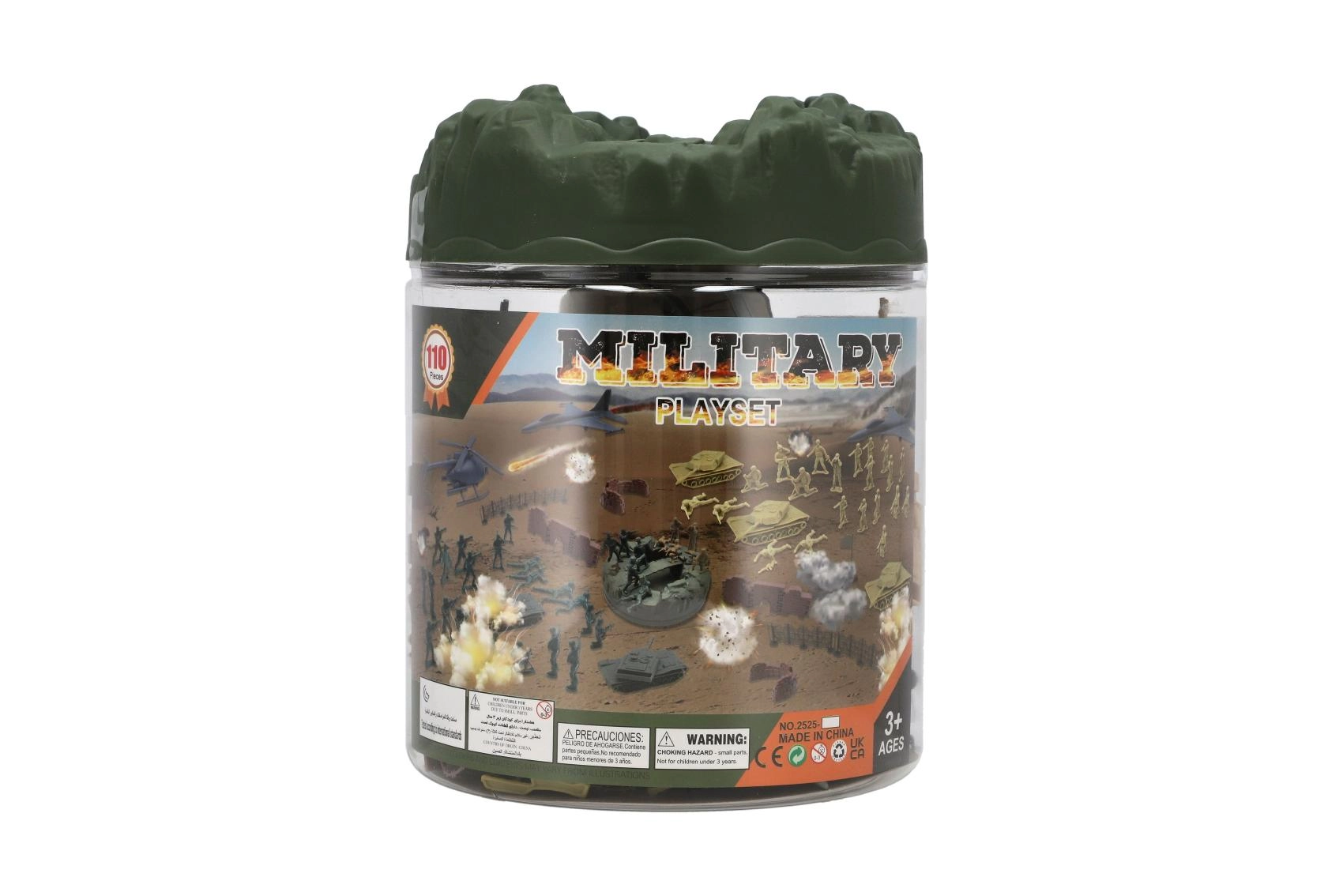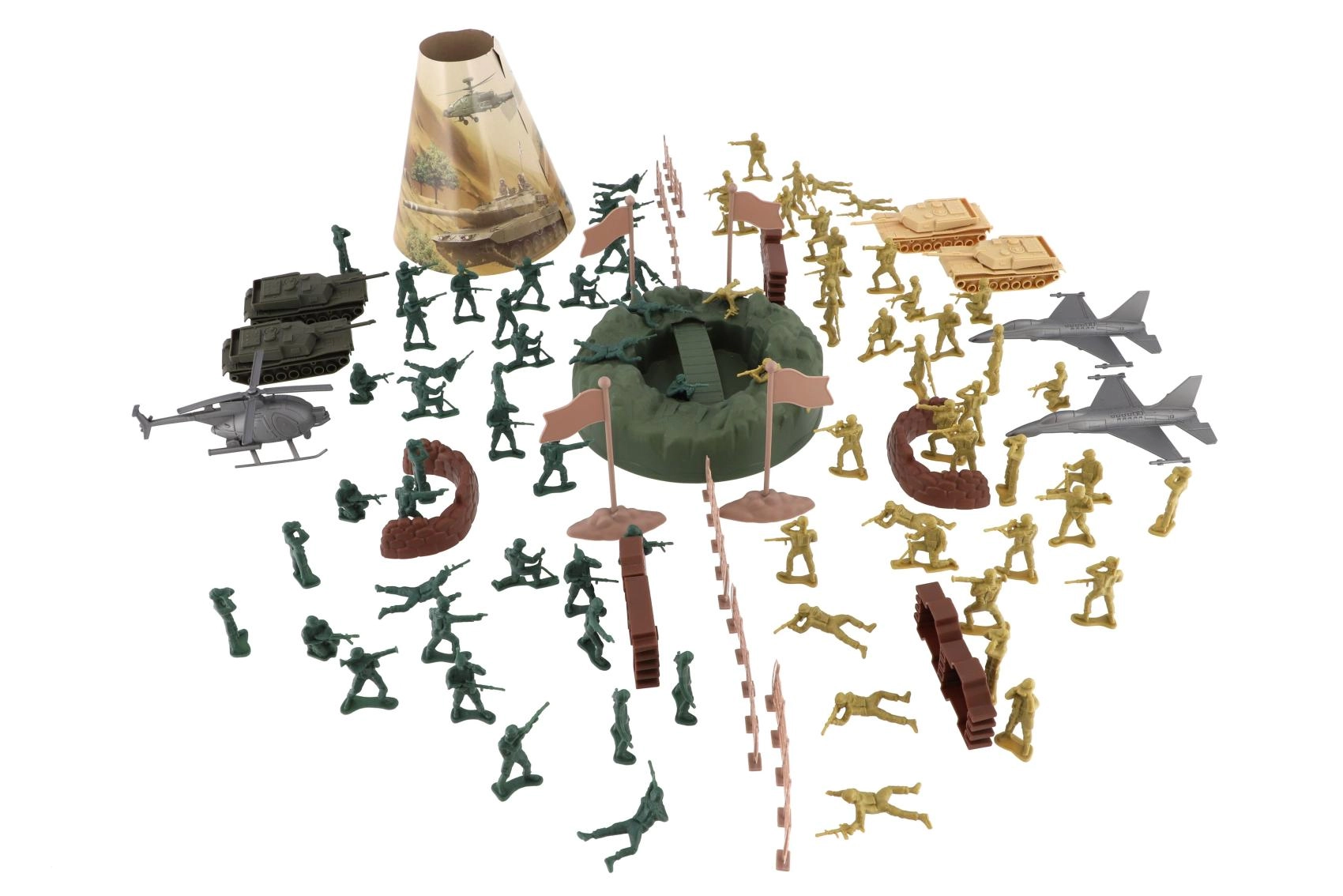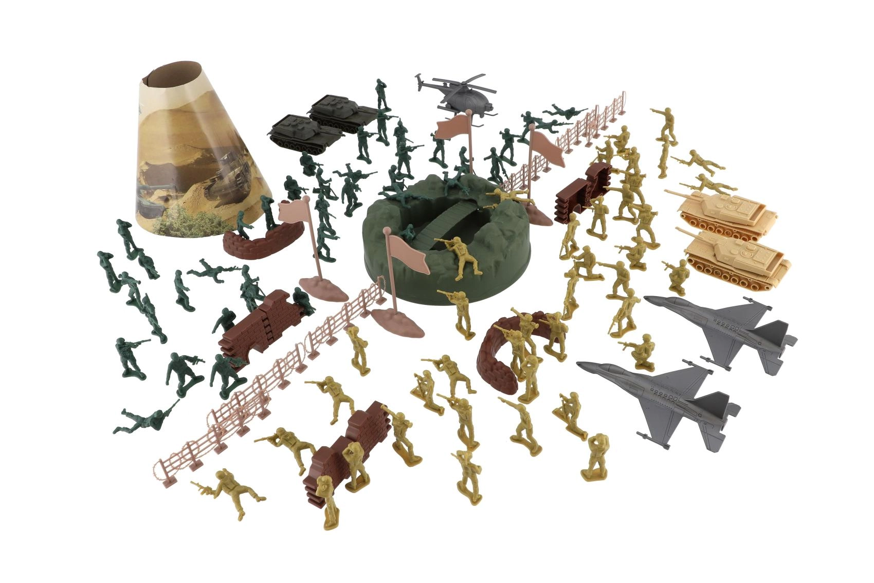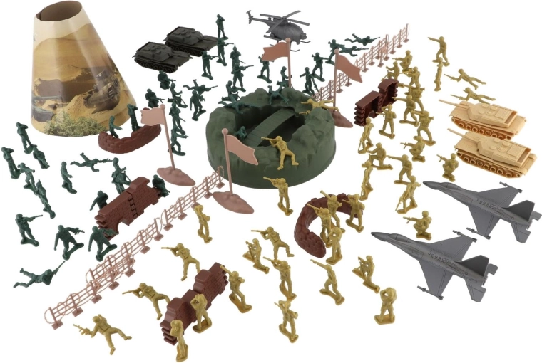 El extenso set militar ofrece todo lo que los niños necesitan para crear emocionantes escenas de batalla. Incluye soldaditos de plástico en varias poses, tanques, aviones y helicópteros, así como vallas, barricadas, banderas y un elemento de terreno. Gracias al amplio equipamiento, es fácil construir bases, planificar avances y desarrollar estrategias.
