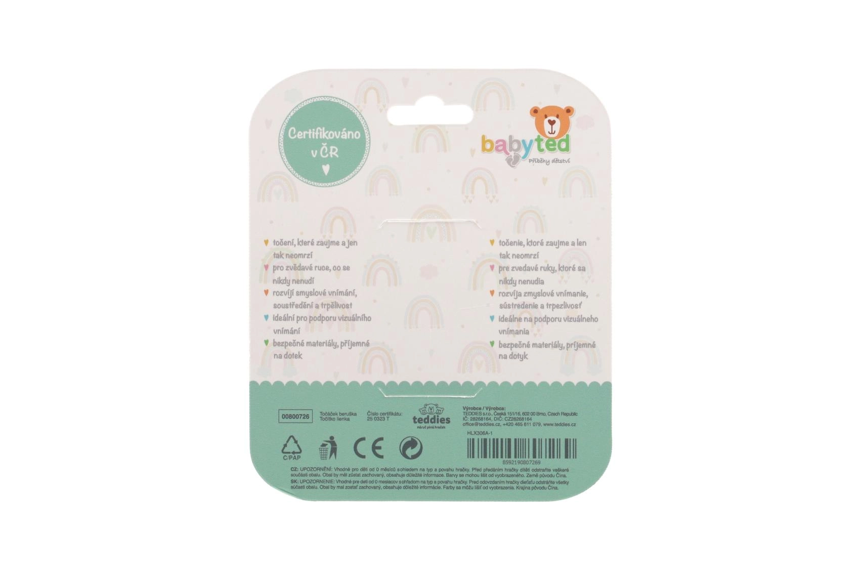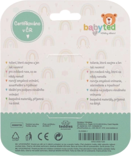 El centro giratorio y los elementos táctiles (burbujas, relieves) invitan a presionar, girar y explorar, desarrollando de forma natural las habilidades de coordinación, el agarre y la motricidad fina. El contraste del rojo con lunares negros y el detalle en verde favorecen la percepción visual y mantienen la atención del bebé.