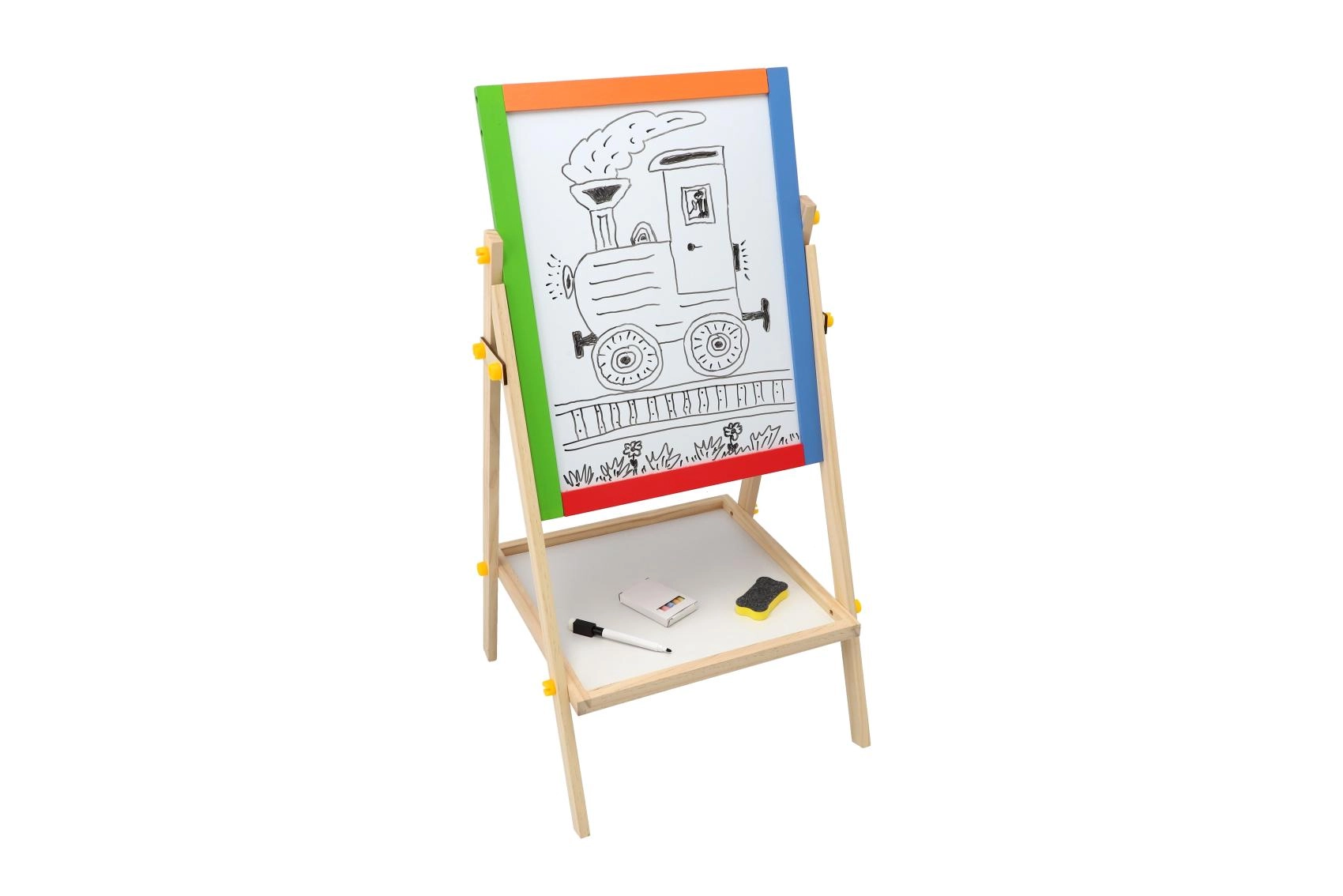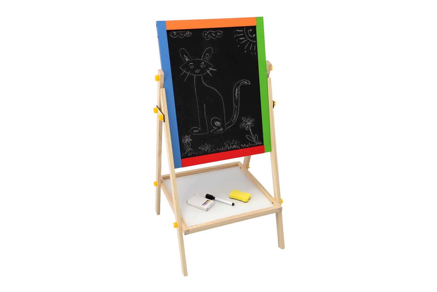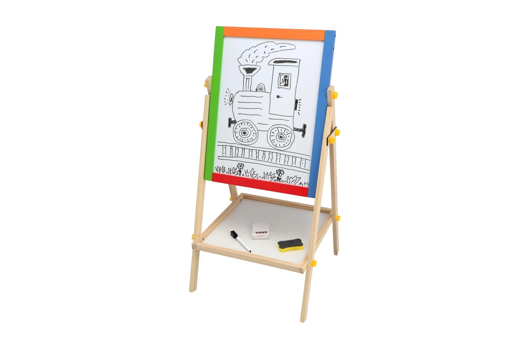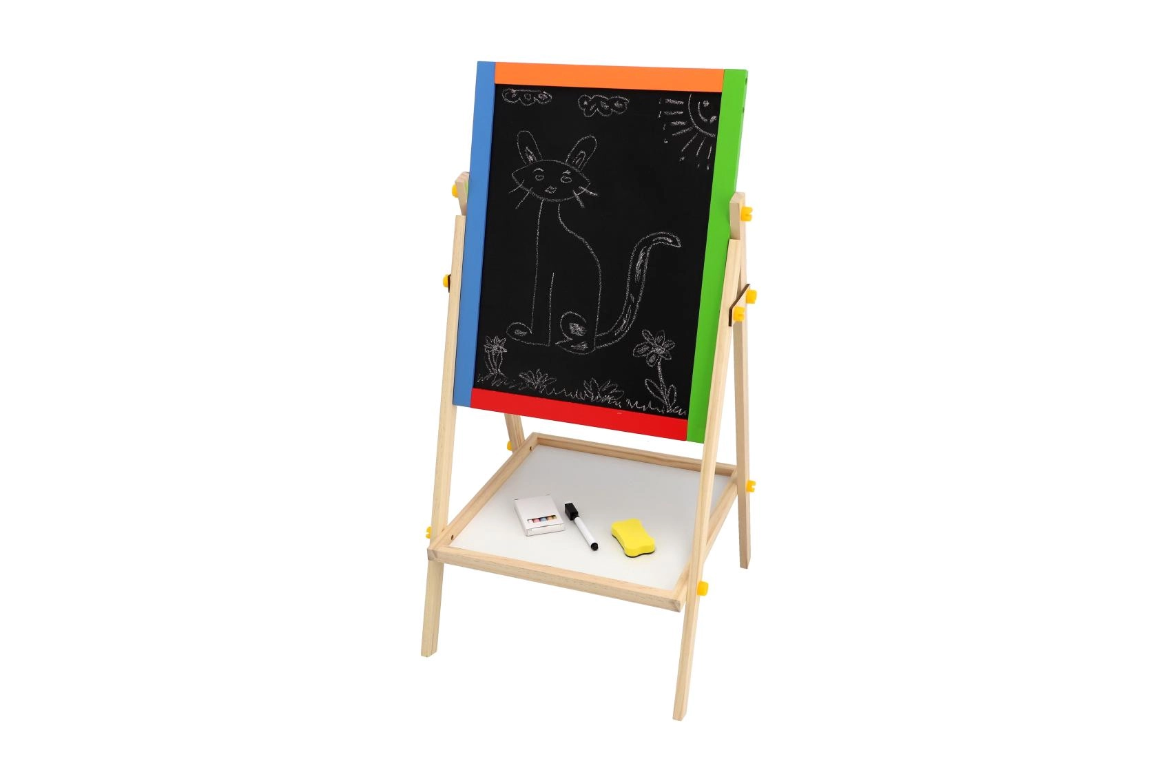 La robusta estructura de madera es estable y segura, mientras que la práctica bandeja mantiene tizas, rotulador y borrador siempre a mano. Gracias a sus dimensiones compactas de 35 × 43 cm, la pizarra es ideal para dormitorios infantiles y salas de juegos.