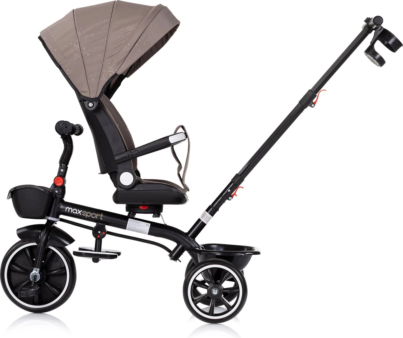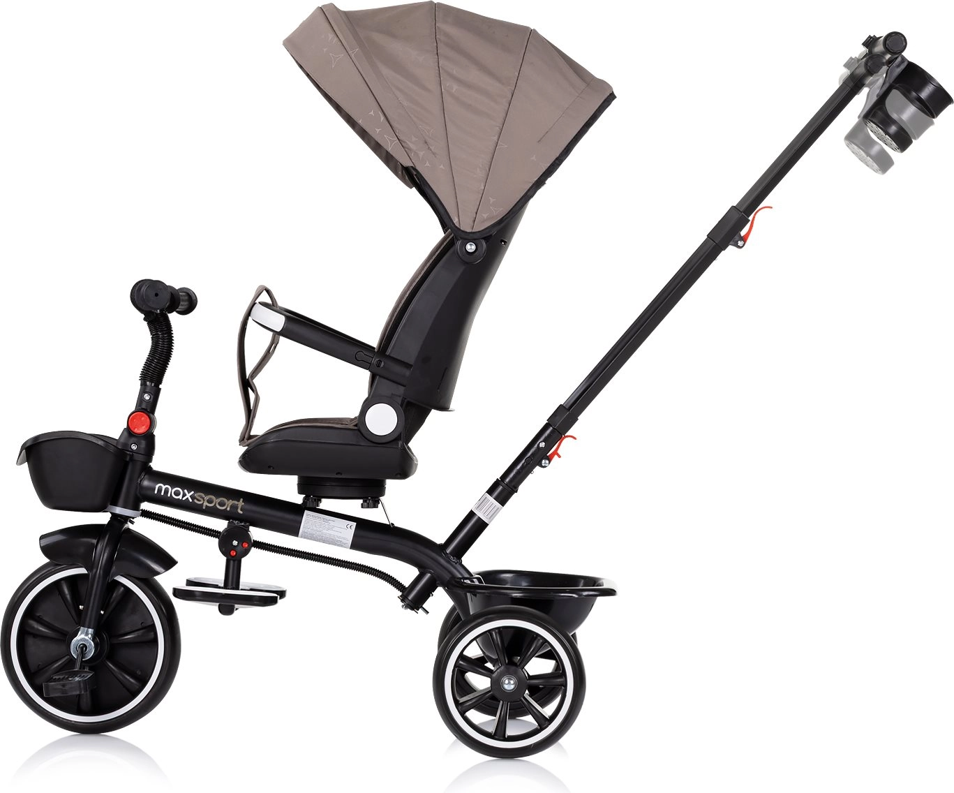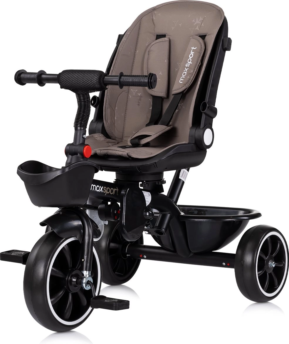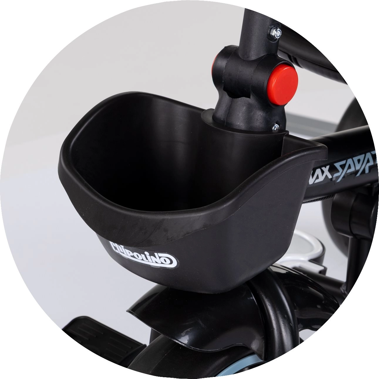 La ergonomía cuidada incluye un asiento ancho y suave con acolchado, ajuste y giro de 360° para facilitar la subida y el cambio de sentido. El niño disfrutará de reposapiés abatibles y la tranquilidad de un cinturón de seguridad. El equipamiento práctico como el portavasos y las cestas delantera y trasera es ideal para juguetes y pequeños objetos.