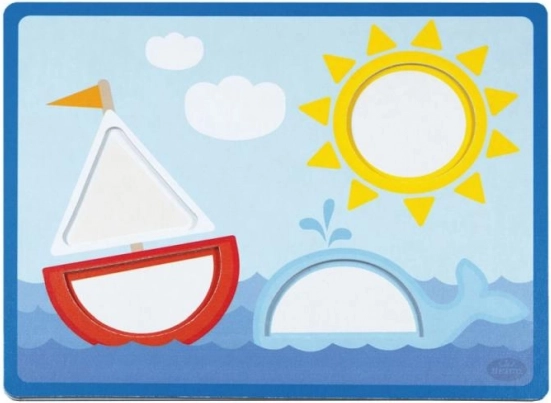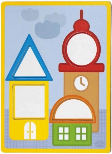 Los niños insertan las piezas de madera en los orificios correctos según las plantillas, adquiriendo de forma natural formas, colores y percepción espacial.