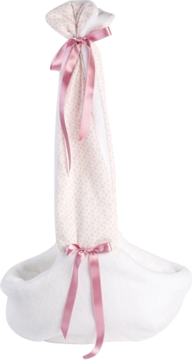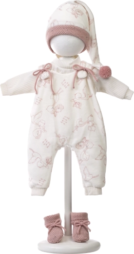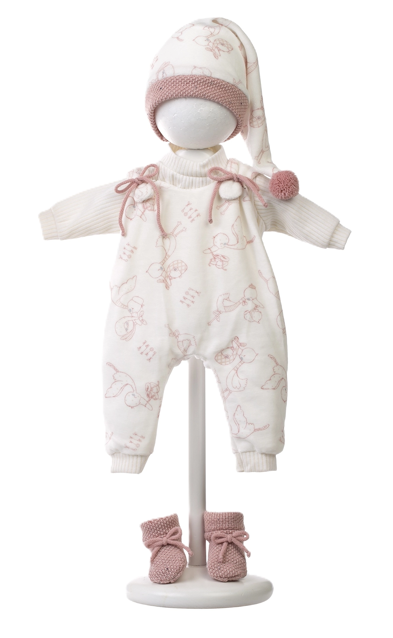 El conjunto incluye body/pelele con un bonito estampado, gorrito largo y botitas de punto en tonos suaves; todo en tejidos agradables para vestir con facilidad y ofrecer comodidad a la muñeca.