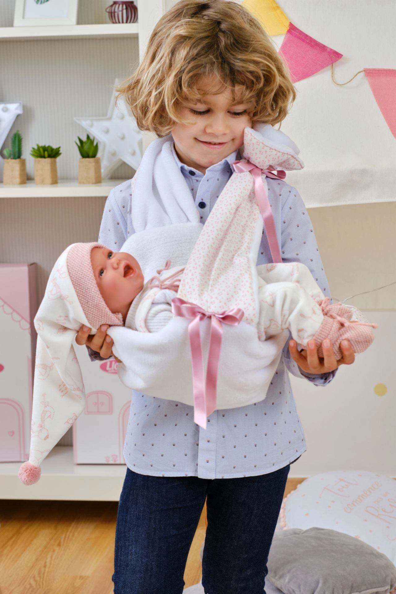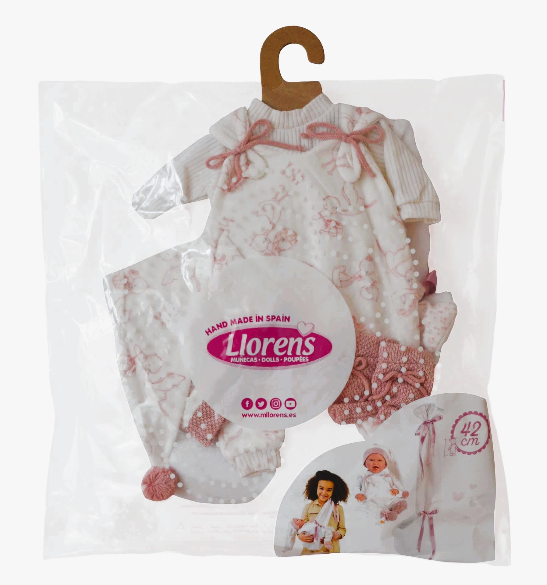 El set está hecho a mano en España y diseñado para muñecas Llorens NEW BORN de 40–42 cm. Gracias a la costura de calidad y a detalles como lazos, ribetes acanalados y botitas de punto, las prendas se ven realistas y elegantes. Genial para desarrollar la motricidad fina, la empatía y la imaginación de los niños.