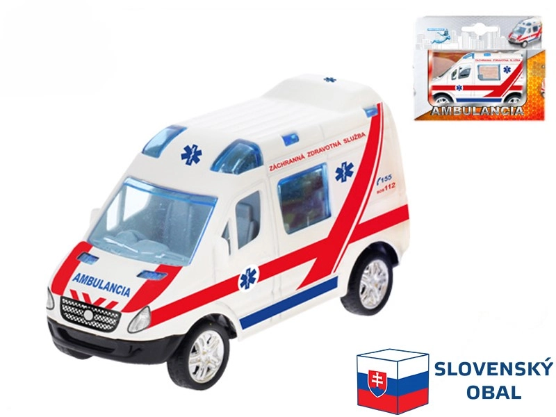 Ambulancia eslovaca de metal de 8 cm, detalladamente elaborada, con estructura resistente, motor de retroceso y diversión que desarrolla la motricidad fina. Ideal para pequeños coleccionistas y amantes de los vehículos de emergencia.