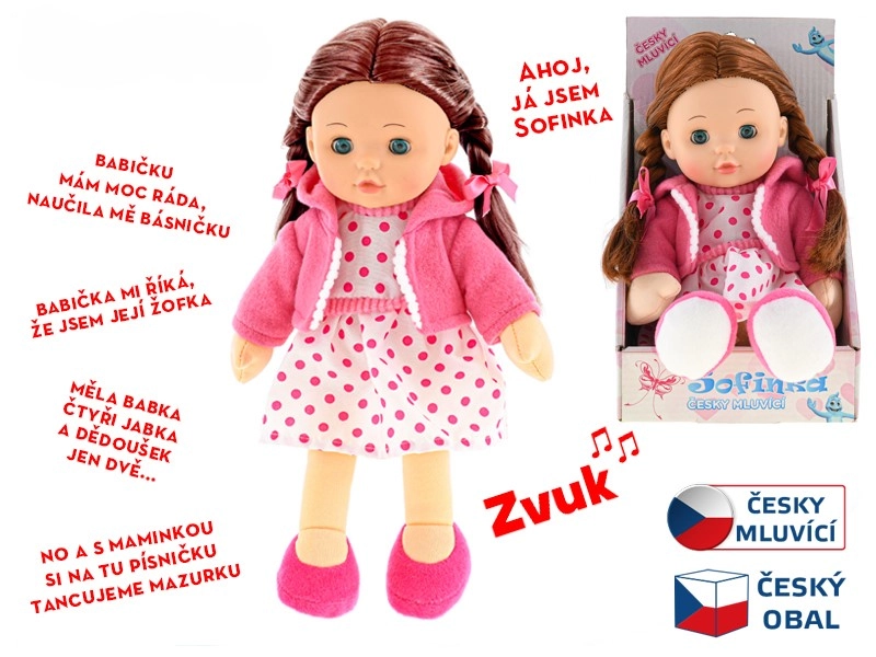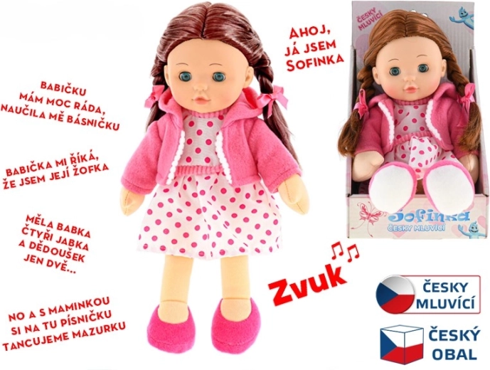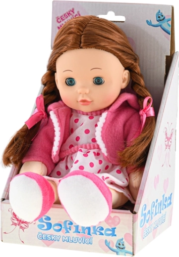 La muñeca Sofinka es la compañera ideal para niños a partir de 3 años. Su cuerpo suave es agradable al tacto e invita a los abrazos, mientras que su aspecto realista con cabello castaño y ojos que pestañean estimula la imaginación infantil. Además, Sofinka habla checo, lo que desarrolla la comunicación y la empatía de forma divertida.