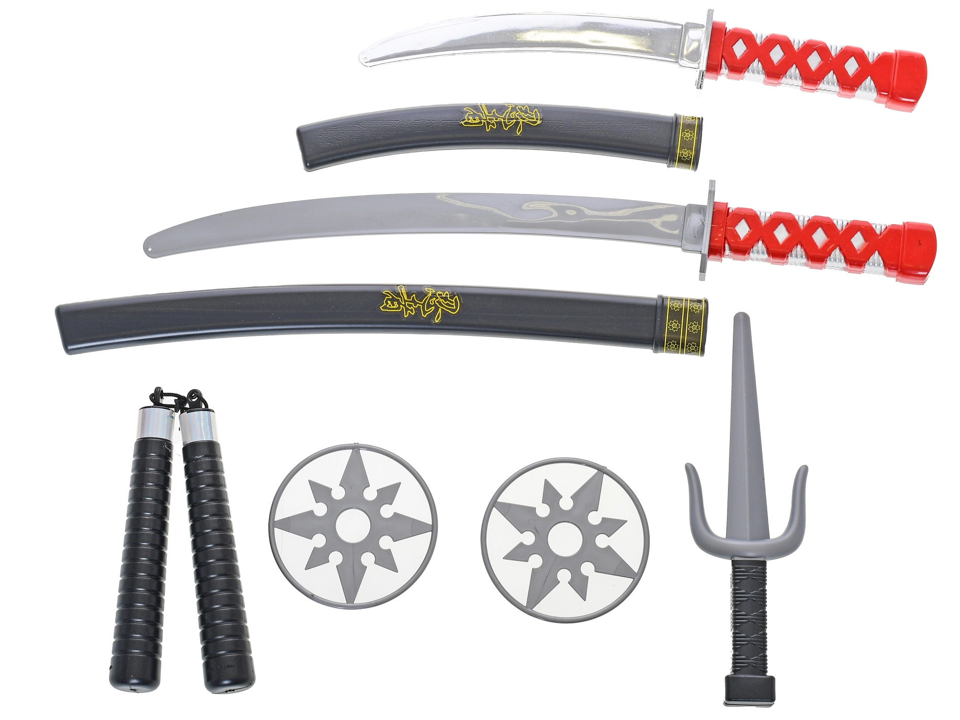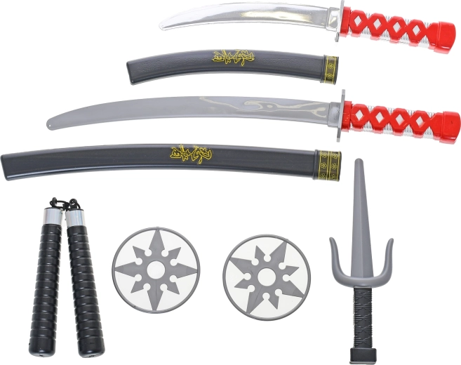 - 2× katana samurái con funda, 1× daga, 1× nunchaku, 2× estrellas arrojadizas