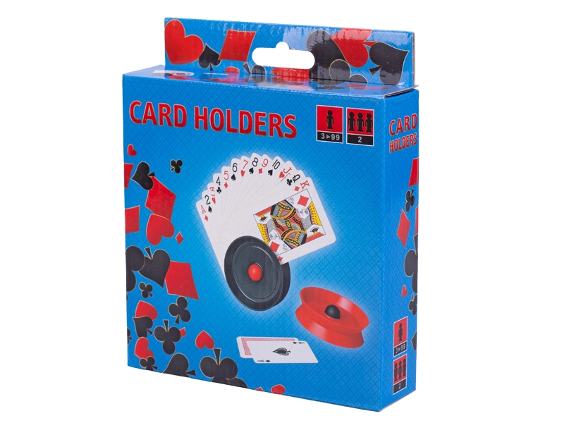 Práctico soporte para cartas de juego de 7 cm que facilita la partida a niños y adultos. El paquete incluye 2 piezas de soportes de plástico resistente en una caja compacta para guardarlos y transportarlos fácilmente. Los soportes garantizan un agarre cómodo y ordenado de las cartas sin forzar los dedos: ideal para jugar en casa o de viaje. Las cartas no están incluidas.