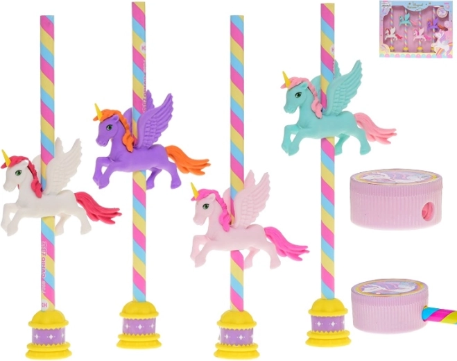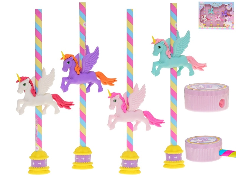 El set de lápices Unicornio es una opción ideal para el estuche escolar y para crear en casa. Cuatro lápices de madera con dureza HB garantizan una escritura suave sin manchas, las gomas integradas permiten correcciones rápidas y el sacapuntas incluido mantiene las puntas siempre afiladas. Los divertidos motivos de unicornios aportan un toque de fantasía a cada día.