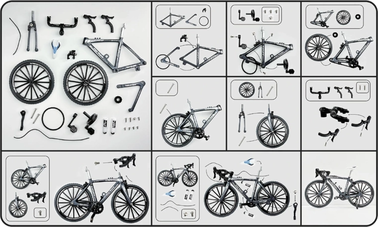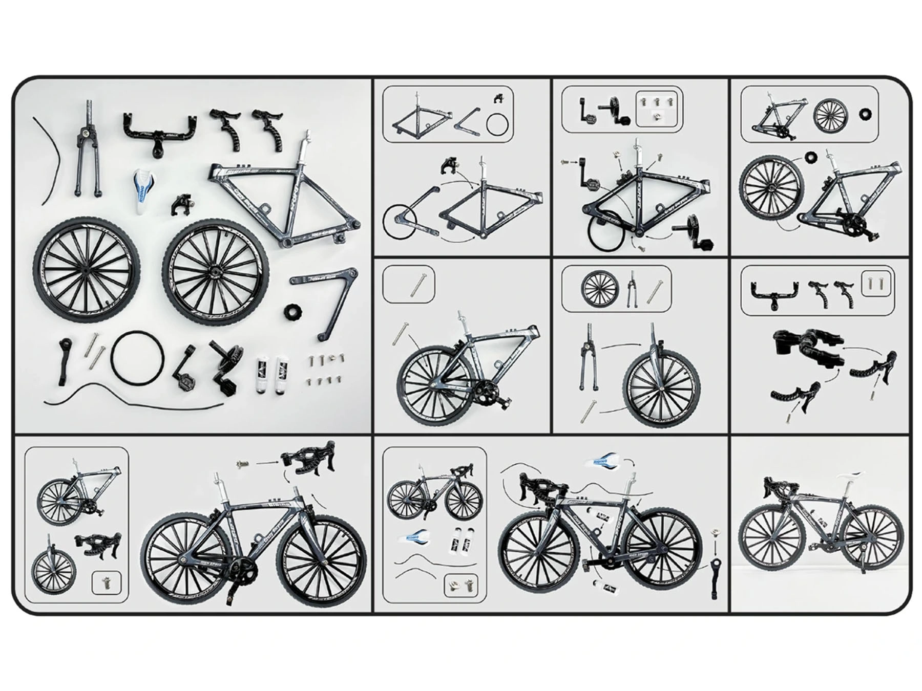 El kit para montar una bicicleta de carreras de metal es una opción ideal para pequeños constructores y aficionados al ciclismo. Las piezas claras, las prácticas herramientas incluidas y un concepto sencillo garantizan que incluso los principiantes puedan completar el montaje. El modelo final destaca por su resistencia, su nivel de detalle y su aspecto impresionante en variantes de color rojo, amarillo y negro.