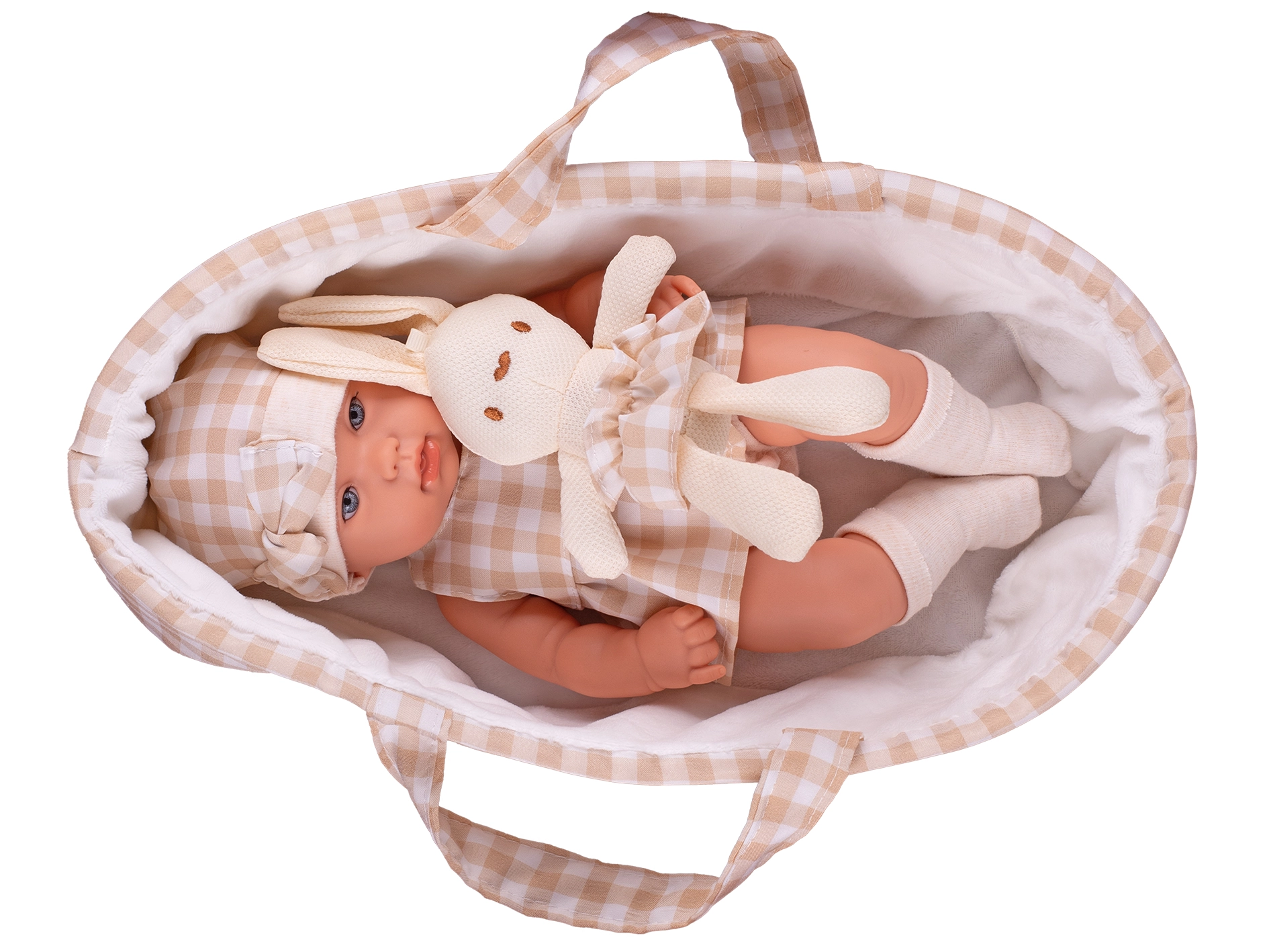 - Conjunto completo: muñeca, portabebés y conejito de peluche en armoniosos tonos beige.