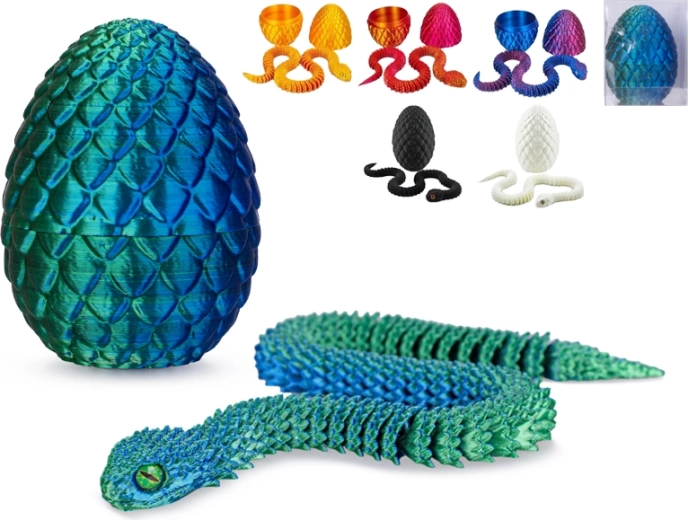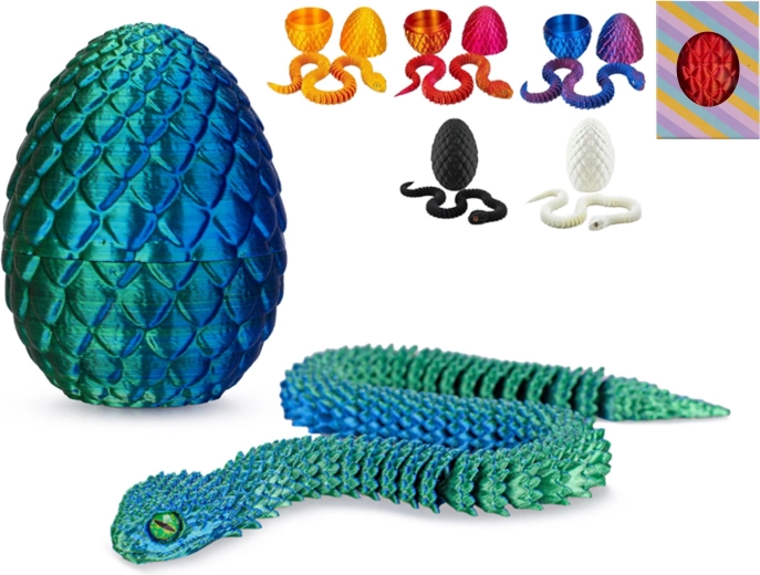 El huevo de dragón con serpiente ofrece a los niños aventuras emocionantes y espacio para desarrollar la imaginación. Al abrir el huevo con textura de escamas de dragón descubrirás una serpiente elástica con detalles realistas que, al estirarla, alcanza una longitud de 30 cm. El juguete está fabricado en plástico resistente y, gracias a sus dimensiones compactas, se adapta muy bien incluso a las manos más pequeñas.