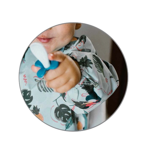 El babero con estampado de tucanes, estiloso y funcional, ofrece cobertura total del torso y las mangas, de modo que la ropa permanece limpia en cada comida y durante el juego más desordenado. Gracias a su material impermeable y fácil de limpiar, es ideal para las primeras comidas autónomas y para actividades creativas.