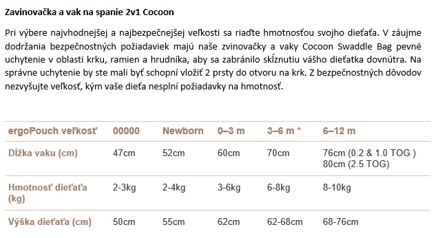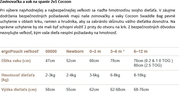 La envoltura y saco de dormir 2 en 1 Cocoon facilita un sueño tranquilo y los cambios nocturnos. La zona del pecho está calibrada a 1,0 TOG para prevenir el sobrecalentamiento y favorecer la respiración libre, mientras que la forma acampanada está aprobada por el Instituto Internacional de Displasia de Cadera como saludable para las caderas. El algodón orgánico GOTS con forro de bambú es suave, transpirable y delicado incluso con la piel sensible y con eccema.