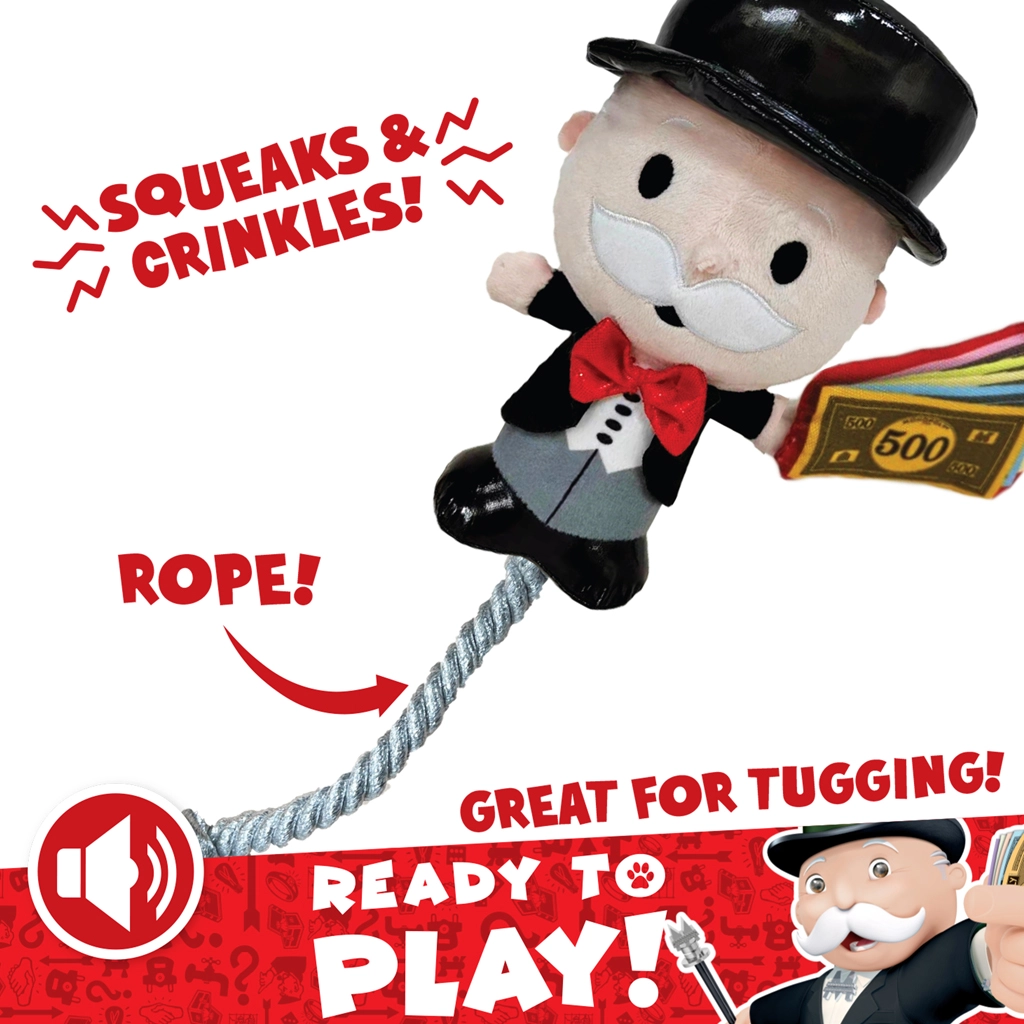 Divertido y resistente juguete de peluche para perros con diseño de MONOPOLY que ofrece diversión interactiva para perros pequeños, medianos y grandes. La figura de Mr. Monopoly combina un suave peluche para acurrucarse y una cuerda resistente para jalar. El chirridor y material crepitante integrados estimulan los sentidos y fomentan el juego activo, mientras que el tamaño compacto de 20 cm es ideal para lanzar, transportar y jugar juntos.