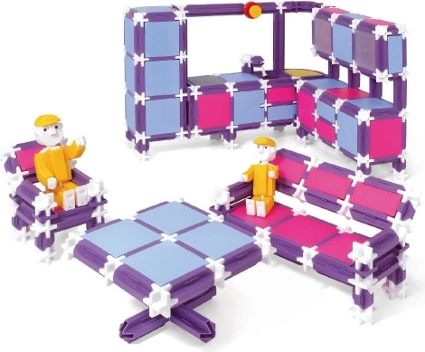 El set de construcción SEVA RODINA – Vivienda ofrece posibilidades variadas para pequeñas y pequeños constructores. Gracias a la combinación de colores morado, rosa y azul claro, surgen modelos originales que encantarán a cualquier niño. Monta una cómoda “pista de aterrizaje” – una cama ancha, una moderna encimera de cocina en esquina con fregadero y frigorífico empotrado, un rincón de comedor, un sofá, estantes, armarios y prácticas estanterías.