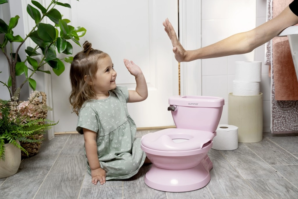 A los niños les encanta imitar a los adultos. La palanca cromada con sonido de descarga real refuerza el hábito y hace que el entrenamiento sea divertido.