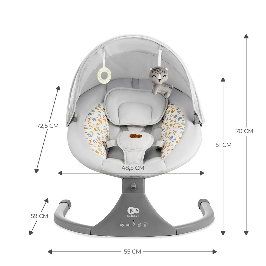 - Manejo sencillo: 5 velocidades de balanceo, 12 melodías, control de volumen, temporizador y mando a distancia.