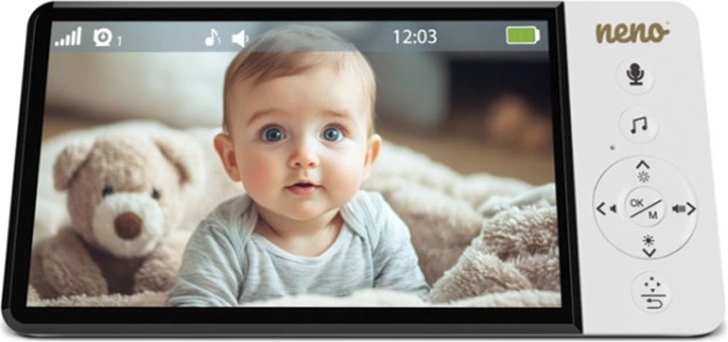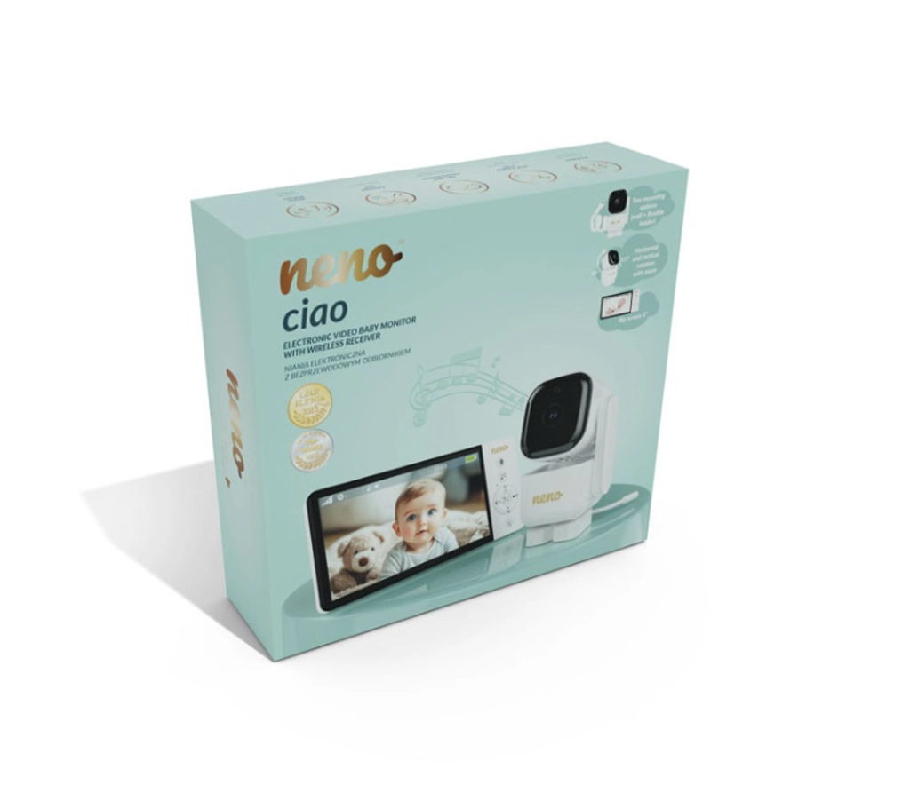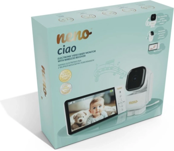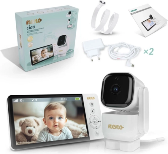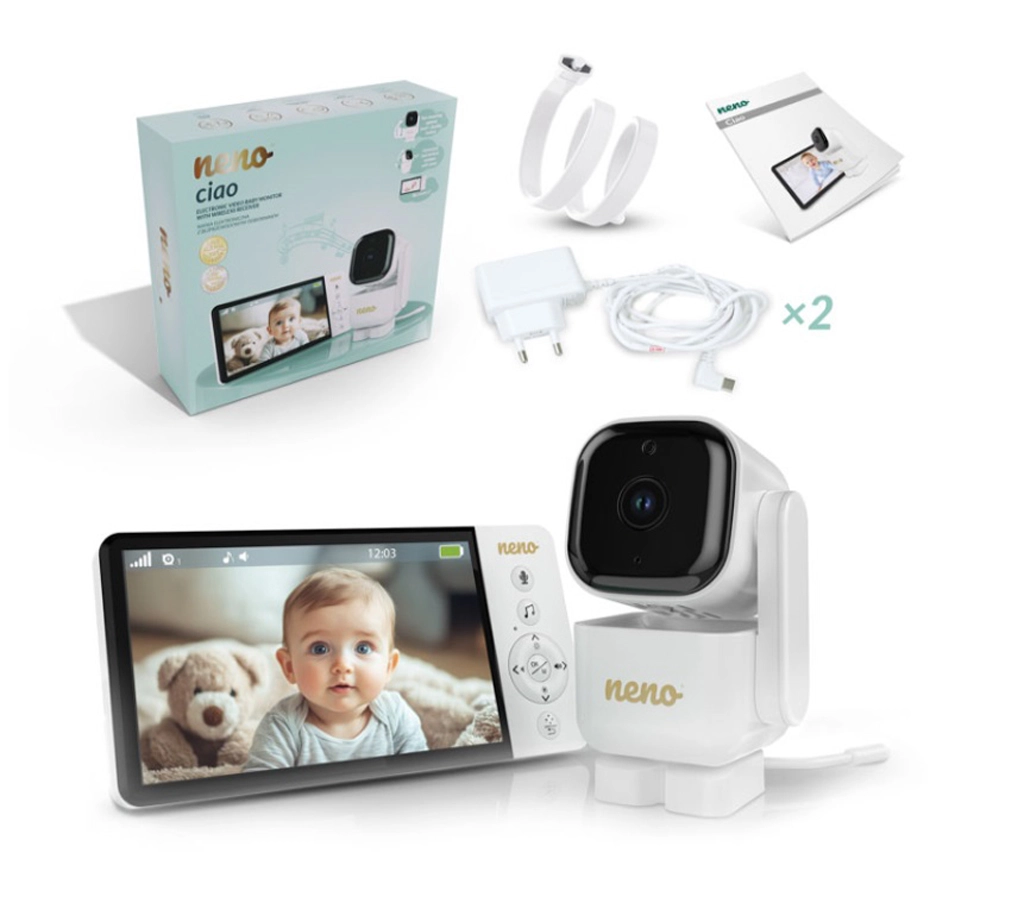 El vigilabebés inteligente Neno Ciao te ofrece tranquilidad gracias a su pantalla a color de 5", cámara giratoria Pan & Tilt (355°/90°), visión nocturna, comunicación bidireccional y tecnología VOX para ahorrar energía. El transmisor tiene un alcance de hasta 300 m, sensor de temperatura, 8 nanas relajantes y autonomía del receptor de hasta 12 horas con la batería integrada de 5000 mAh.