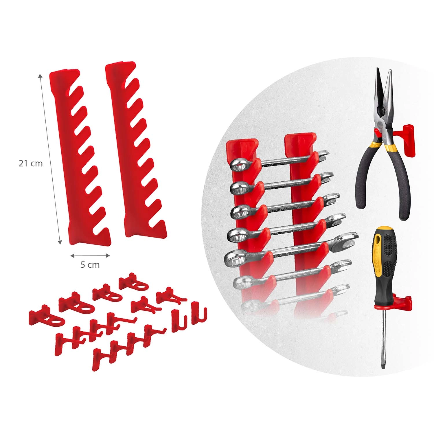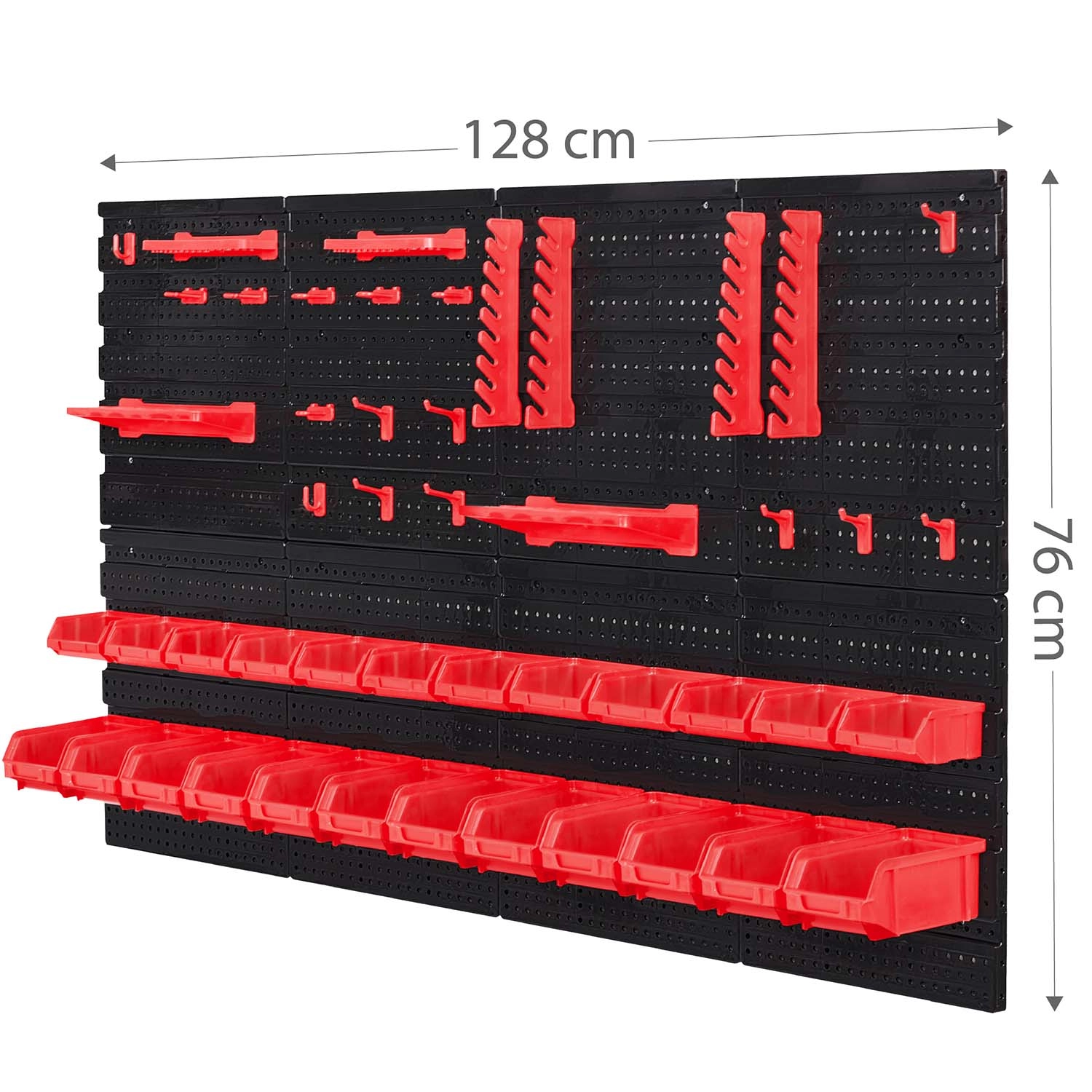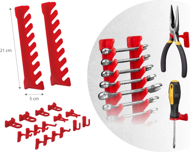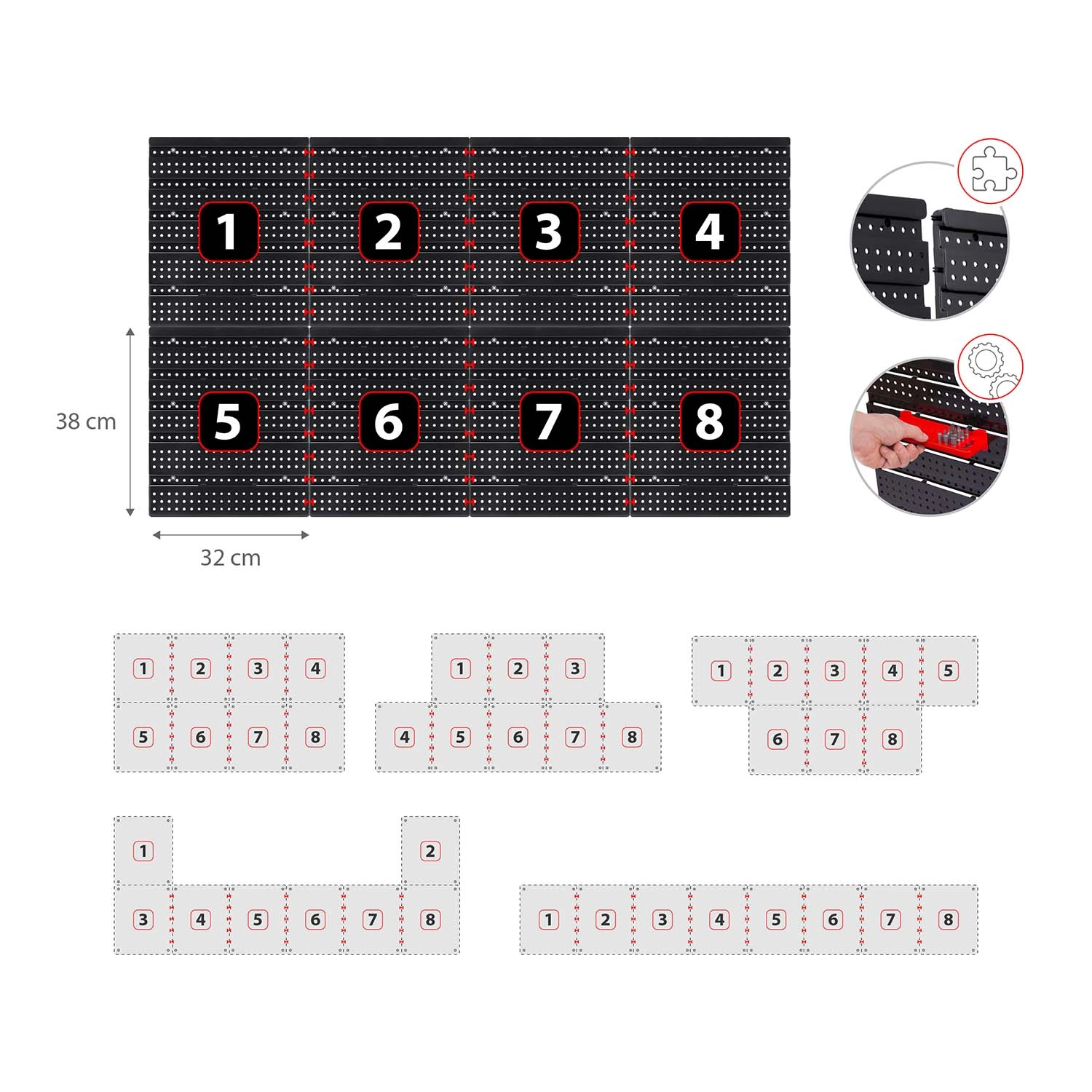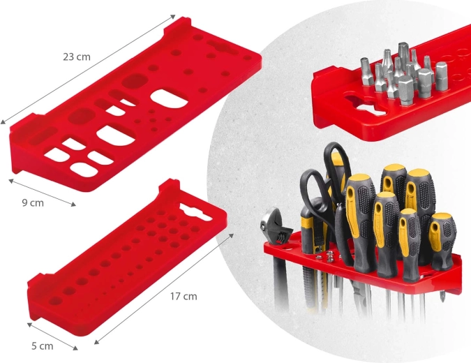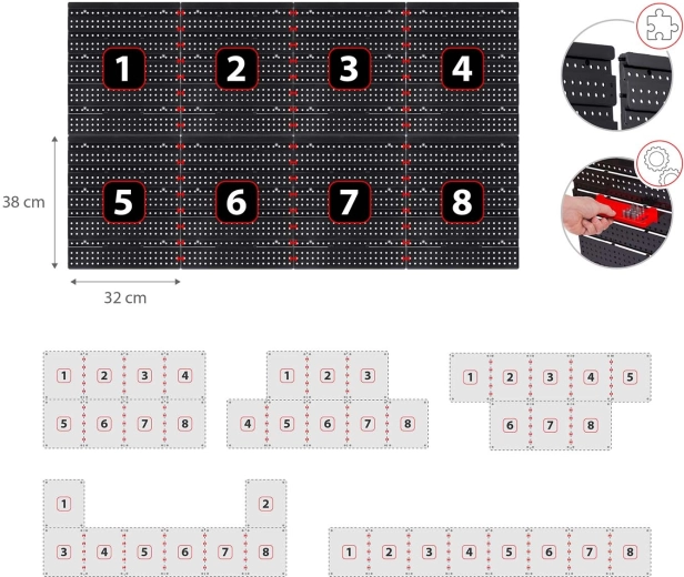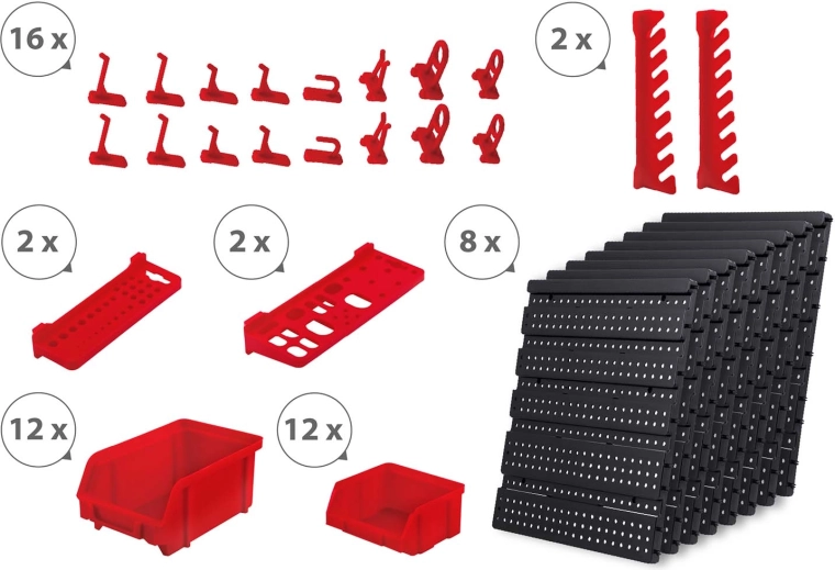 Contenido del set: 6 paneles modulares, 12 cajetines pequeños (9,5 × 10 × 5 cm), 12 cajetines grandes (16 × 10 × 7,3 cm), 2 estantes de 23 × 9 cm, 2 estantes de 17 × 5 cm, 16 soportes y ganchos, 2 soportes para llaves y tacos de montaje para distintas superficies (hormigón, ladrillo, madera, chapa). El montaje es rápido e intuitivo: los elementos se encajan en la perforación y se pueden reorganizar en cualquier momento.