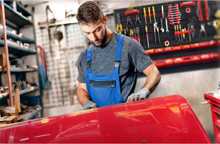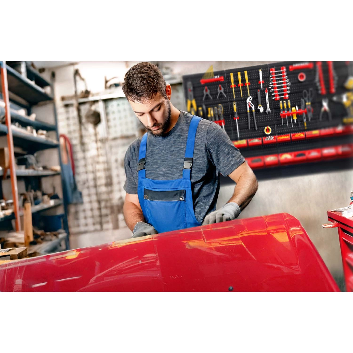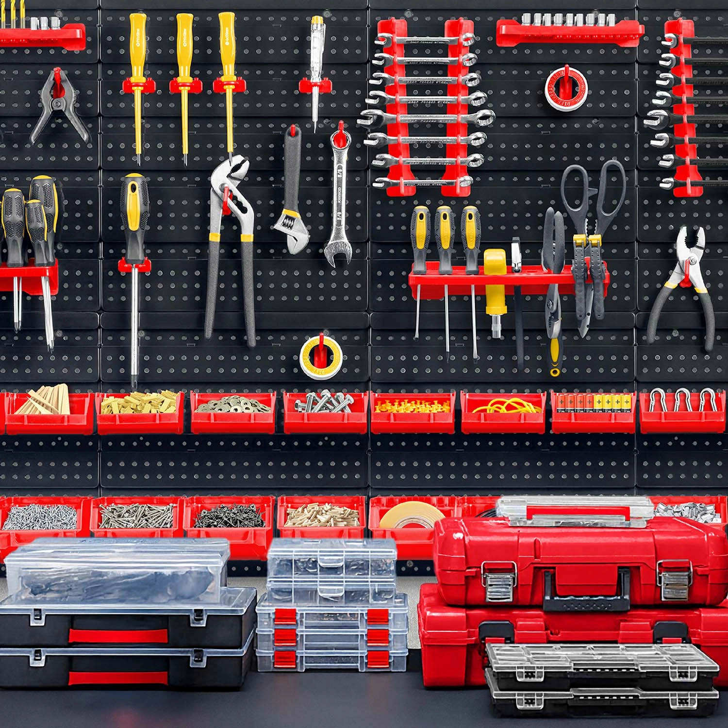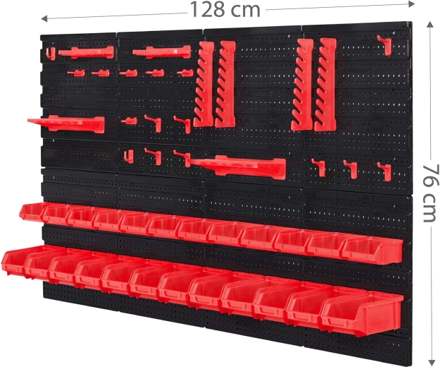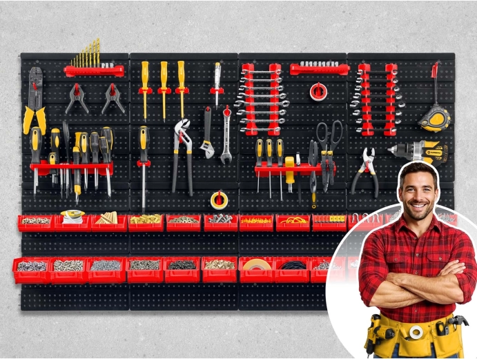Seis paneles perforados y 54 accesorios permiten almacenar de forma clara herramientas manuales, puntas y piezas pequeñas, teniéndolo todo siempre a mano.