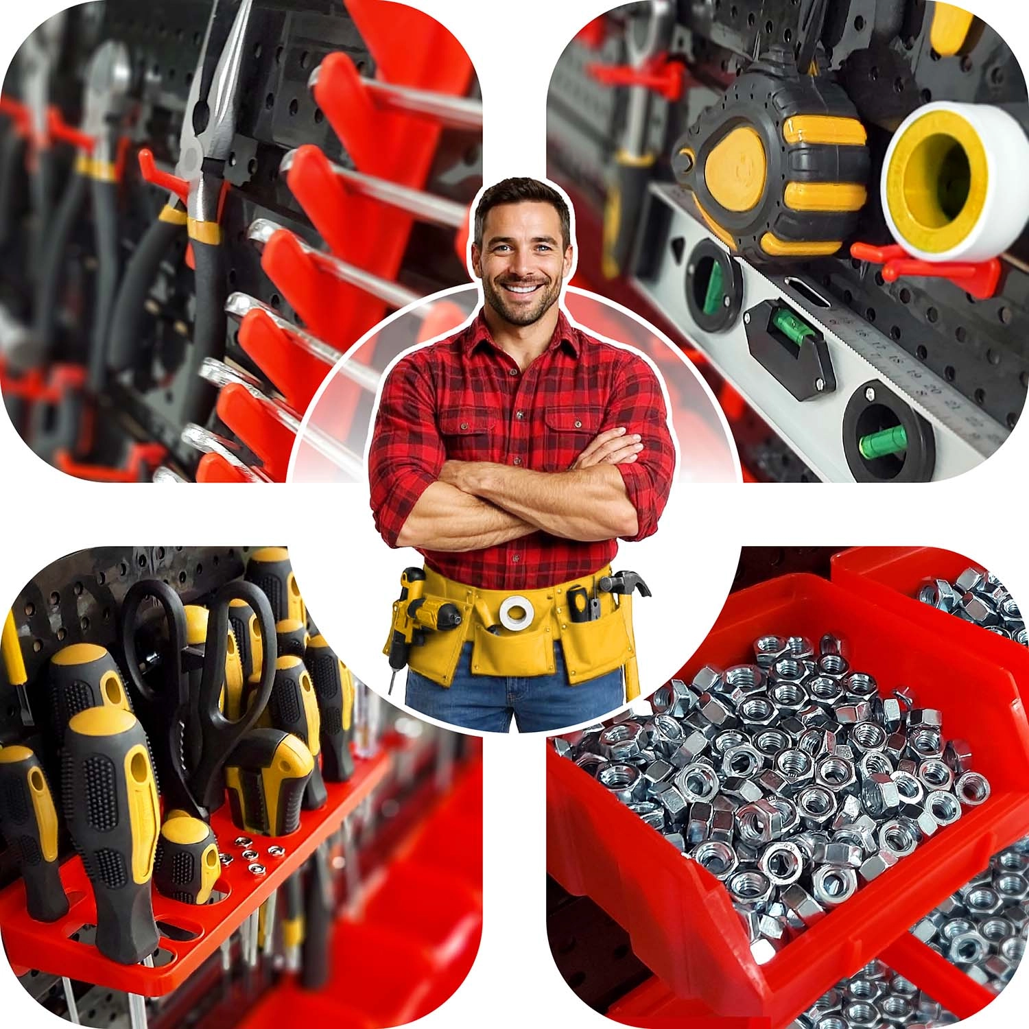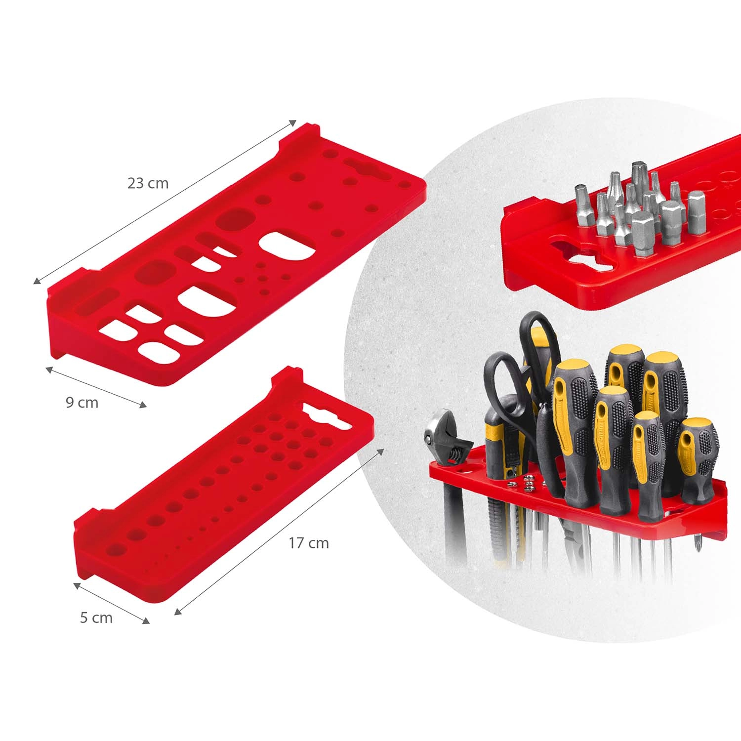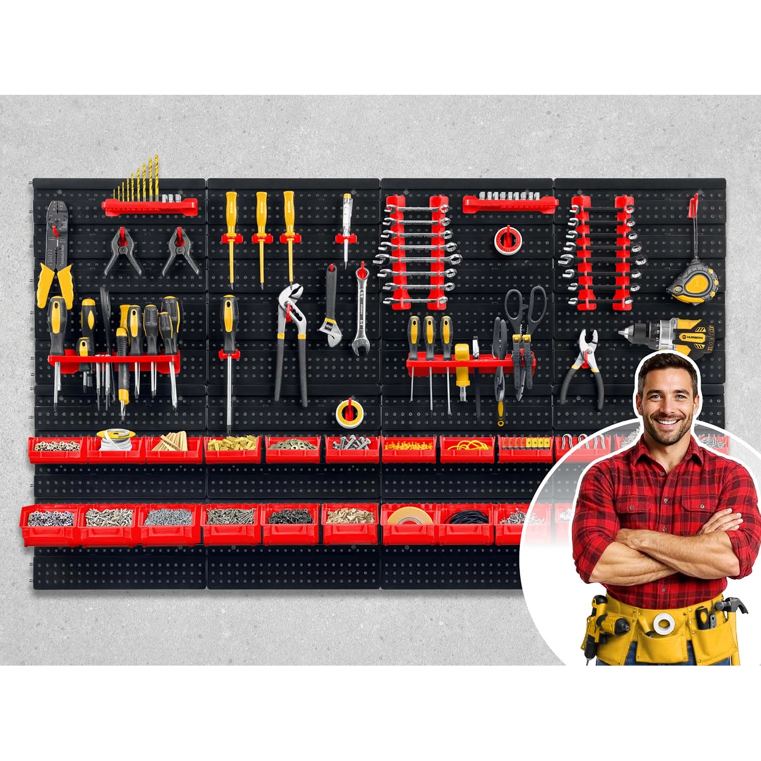 El sistema modular de paneles perforados HUMBERG convierte cualquier espacio en un puesto de trabajo perfectamente organizado. La combinación de ganchos y soportes versátiles, cajetines en dos tamaños y estantes prácticos garantiza que tengas destornilladores, alicates, puntas, brocas y elementos de fijación siempre a mano. Los paneles perforados robustos soportan el uso diario y, gracias a la inteligente composición de los elementos, podrás adaptar el tablero fácilmente a tus hábitos.
