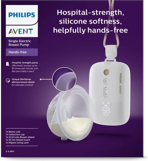 Philips Avent Hands‑Free Premium Plus aporta libertad tanto al amamantar como al extraer. Gracias a la copa totalmente transparente y ligera, tienes siempre control del flujo de leche, mientras que el motor inteligente trabaja con un ritmo similar al de la succión del bebé para una extracción suave y eficaz. El rendimiento silencioso, inspirado en la tecnología hospitalaria, garantiza un uso discreto en casa o de viaje.