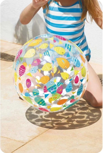 La pelota transparente con peces de colores es muy visible en la piscina y en la playa, y atrae tanto a niños como a adultos a jugar.