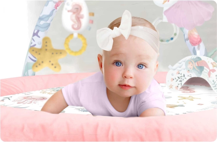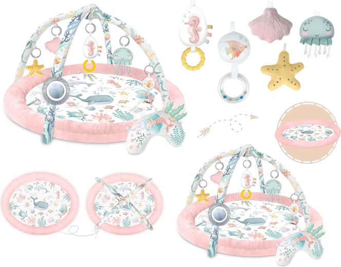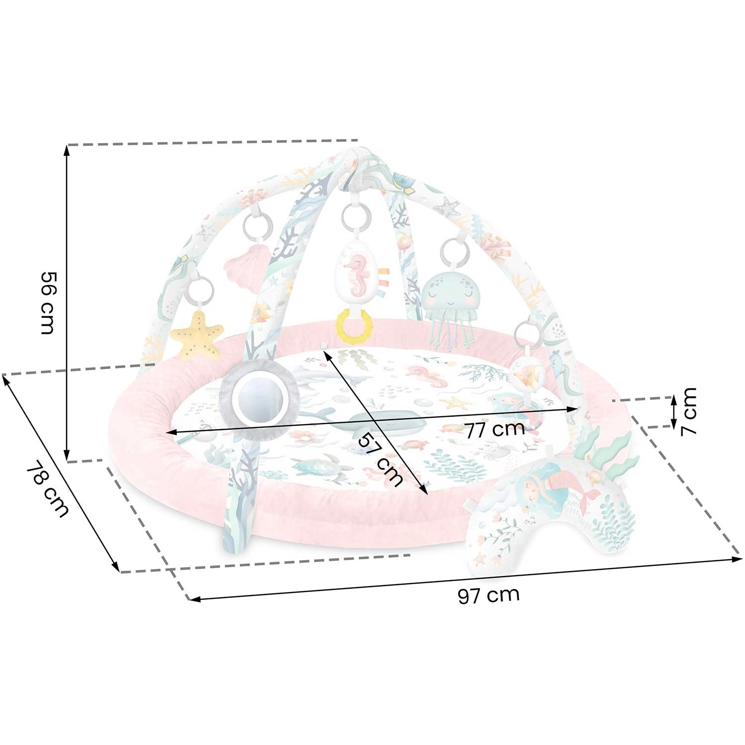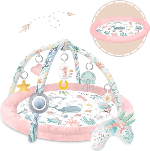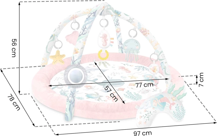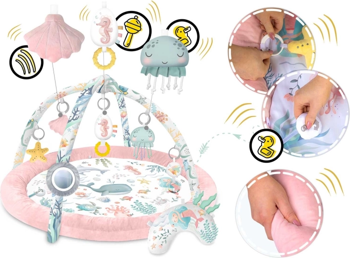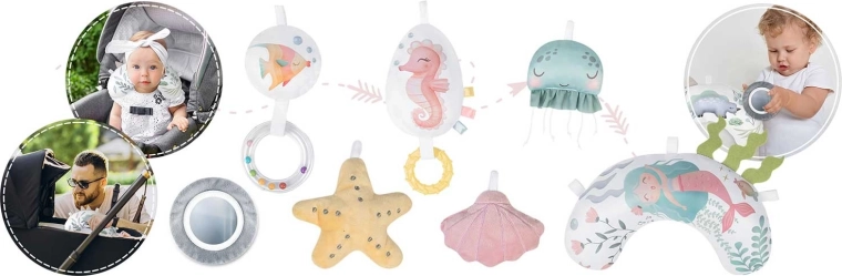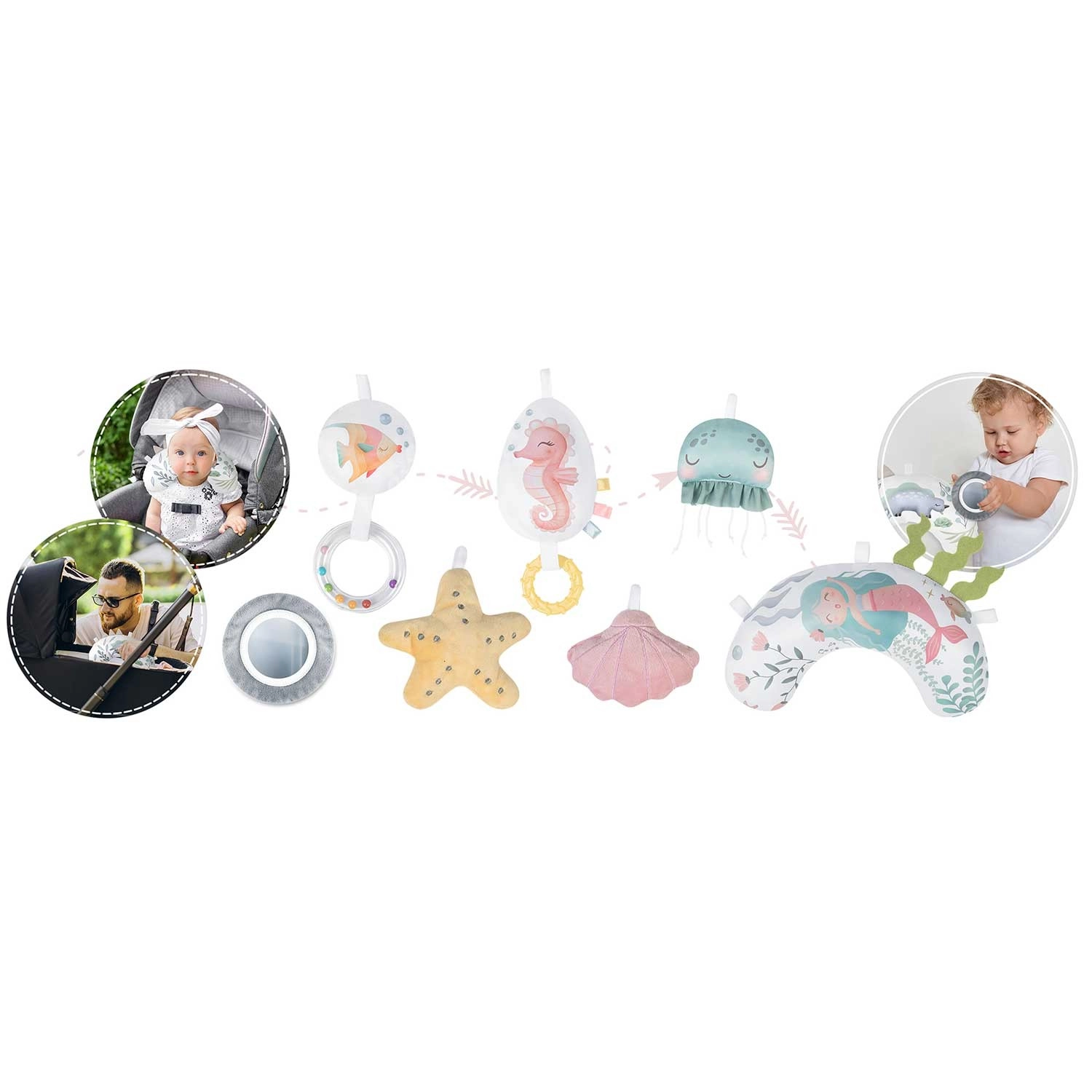 Un espejo, estrella de mar, conchas, medusa, caballito de mar y otros elementos con efectos de sonajero y crujido estimulan la curiosidad, la coordinación ojo–mano y los primeros agarres.
