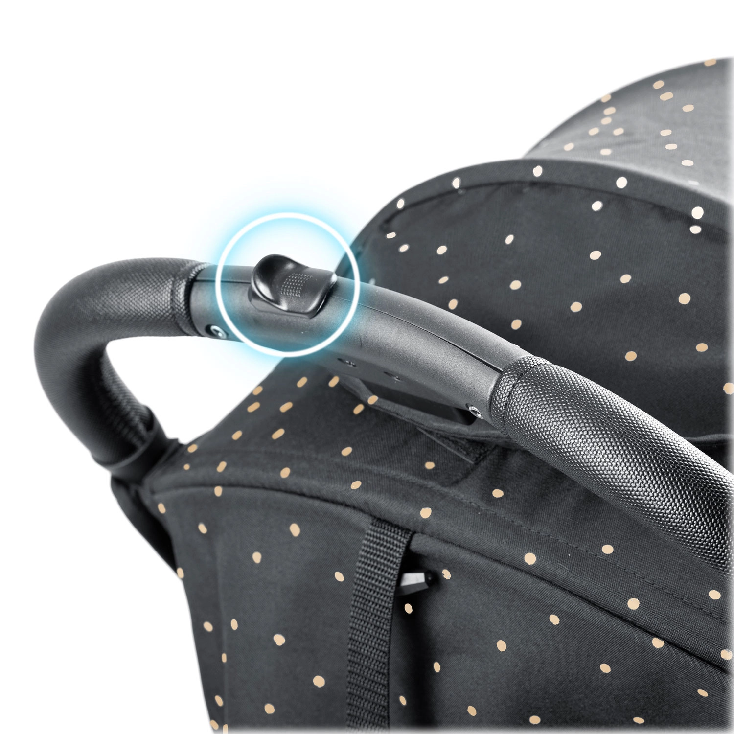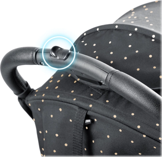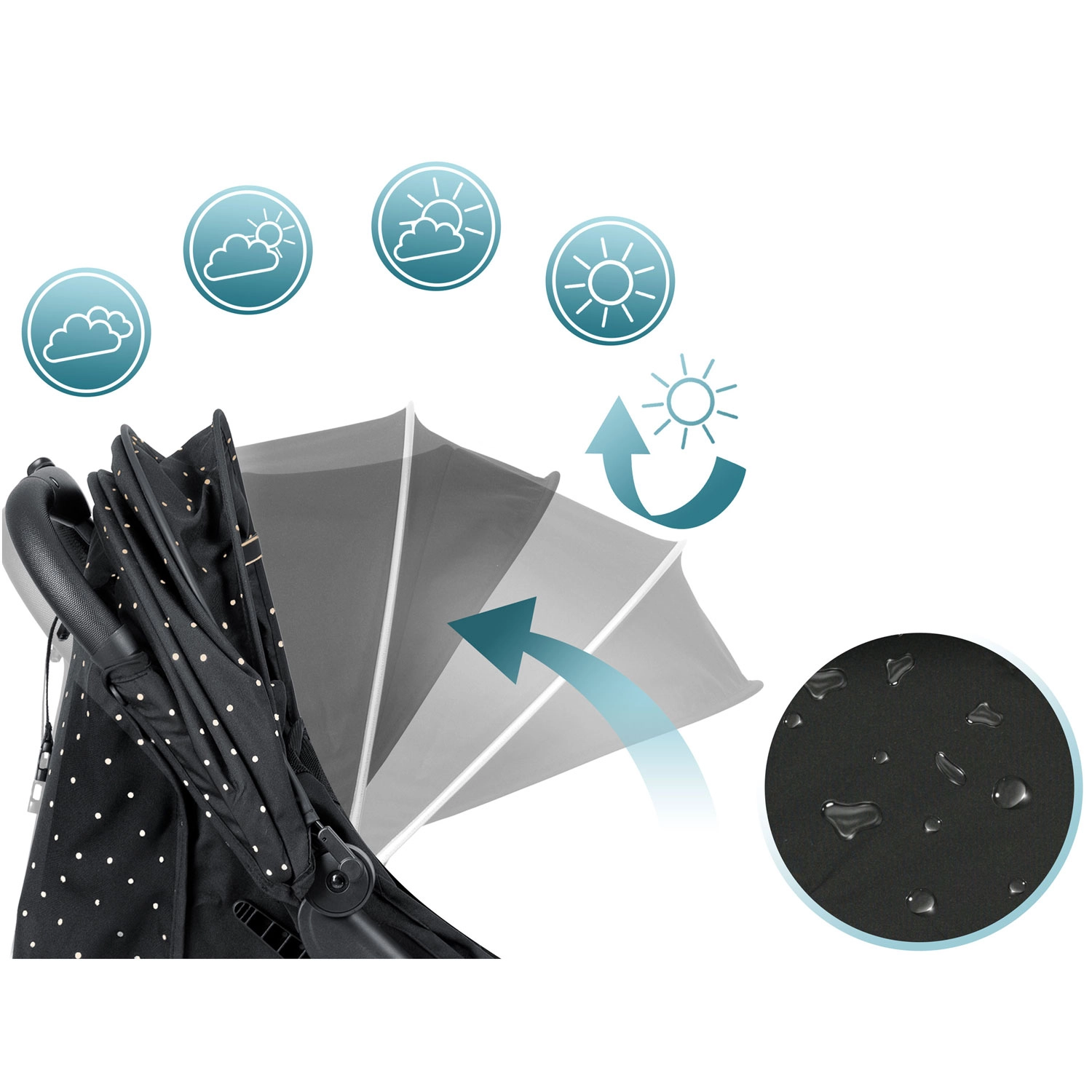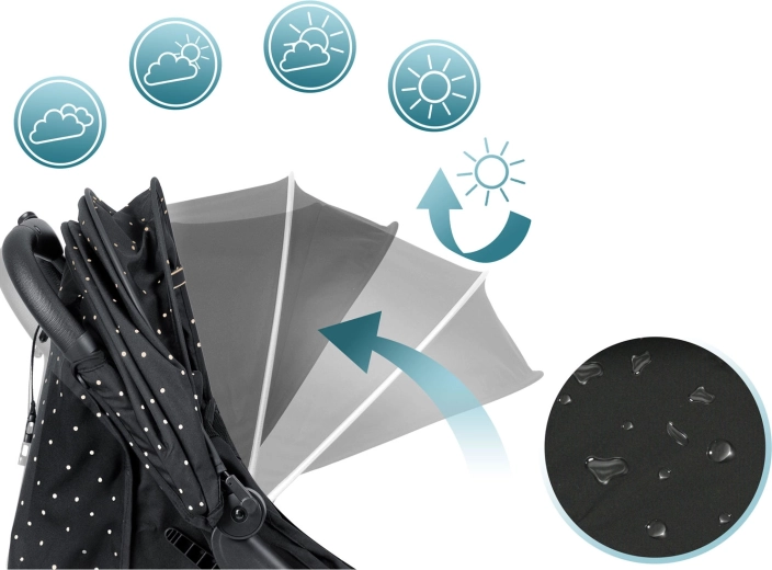La capota con múltiples posiciones protege al niño del sol, el viento y la llovizna. El acabado repelente al agua del material facilita el mantenimiento y asegura confort en cualquier época del año.