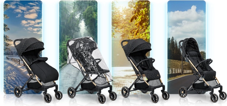 - Confort en cualquier clima: capota con protección UV y lluvia; se incluye plástico de lluvia y cubrepiés.