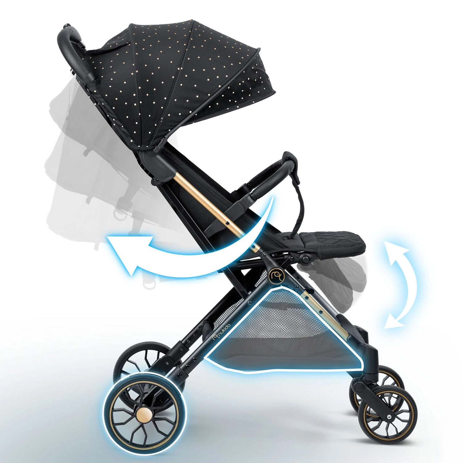 Nukido Paseo combina un diseño inteligente, seguridad y manejo sencillo para ciudad y parque. Su estructura ligera y robusta, las ruedas delanteras giratorias con suspensión y las ruedas traseras más grandes aseguran un desplazamiento fluido sobre baches. El plegado rápido con una mano y las dimensiones compactas al plegar facilitan el transporte y los viajes, incluida la aviación.