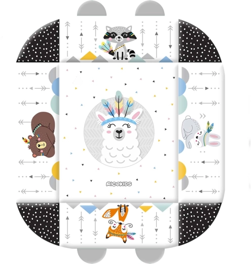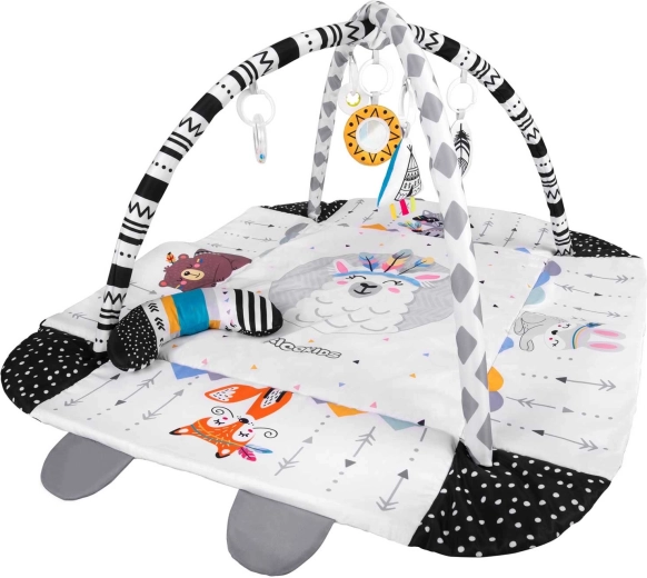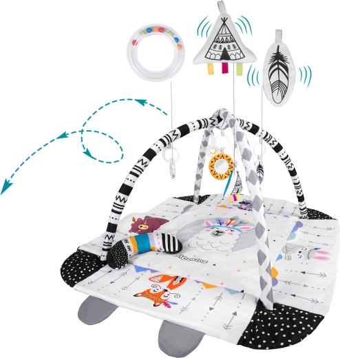 La alfombra de juego RICOKIDS Boho 110 × 100 cm crea un nido acogedor y seguro para el descubrimiento diario. Dos arcos cruzados con juguetes colgantes extraíbles (sonajeros, mordedores, espejo) favorecen el seguimiento visual, la coordinación mano-ojo y la motricidad fina. El acolchado suave y los laterales elevables garantizan comodidad y protección durante el juego, mientras que los motivos contrastados y de animales aportan estimulación visual.